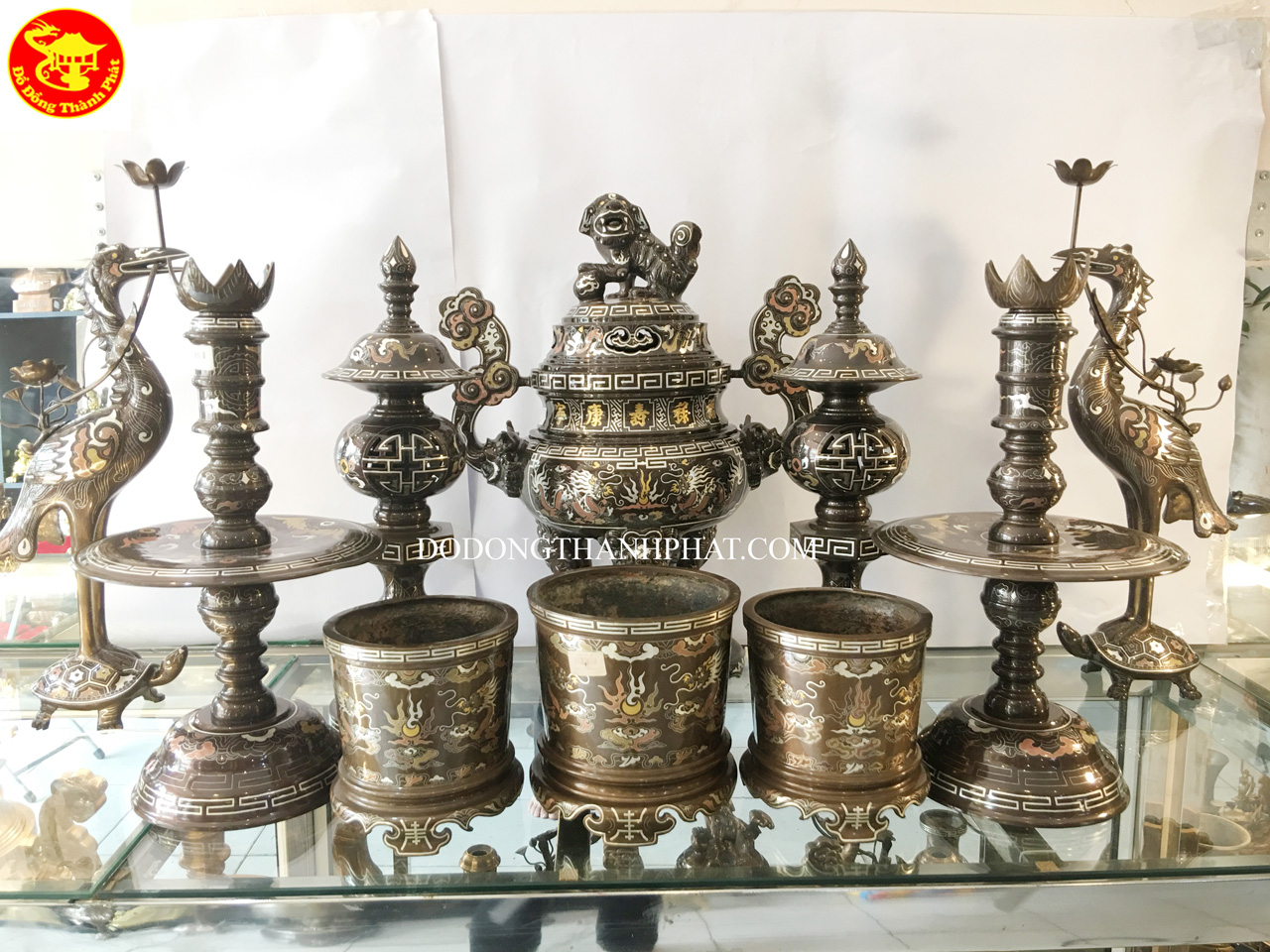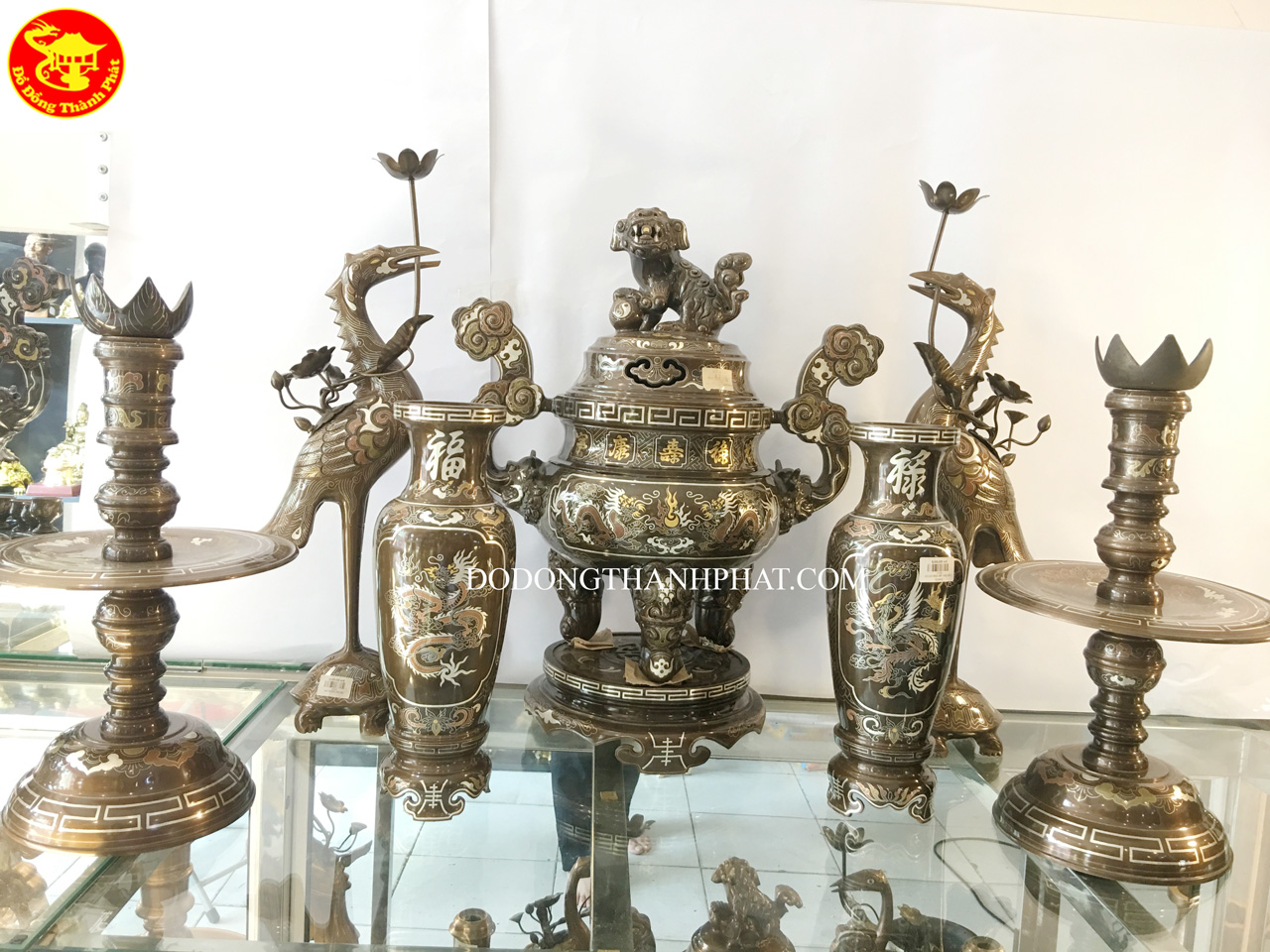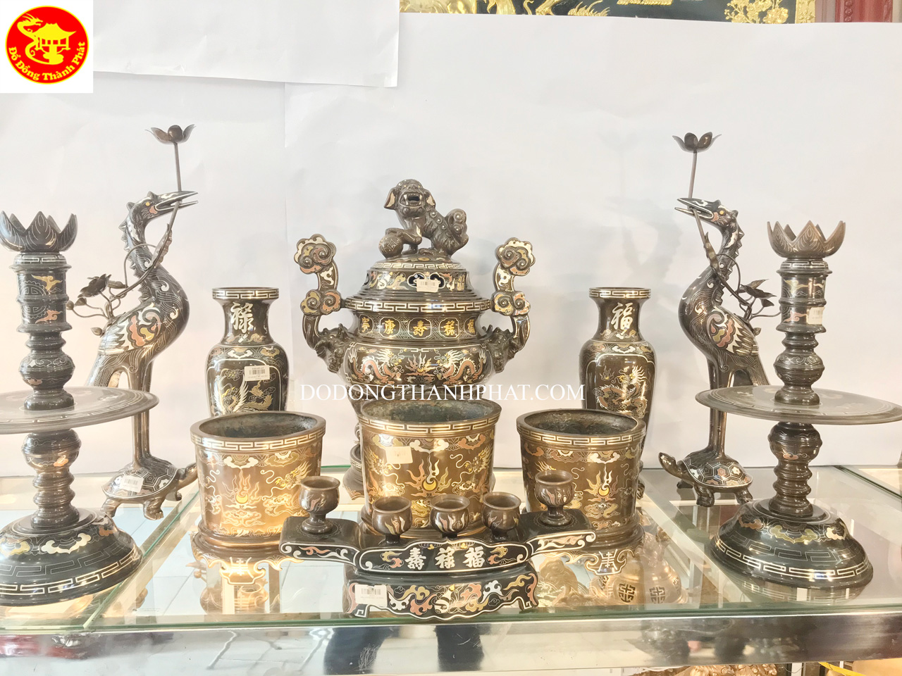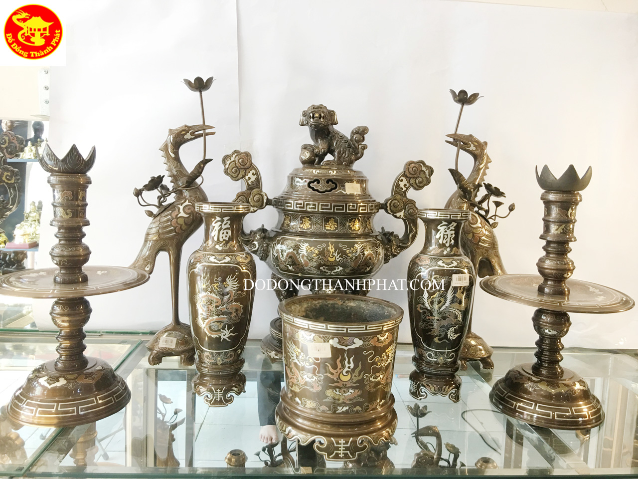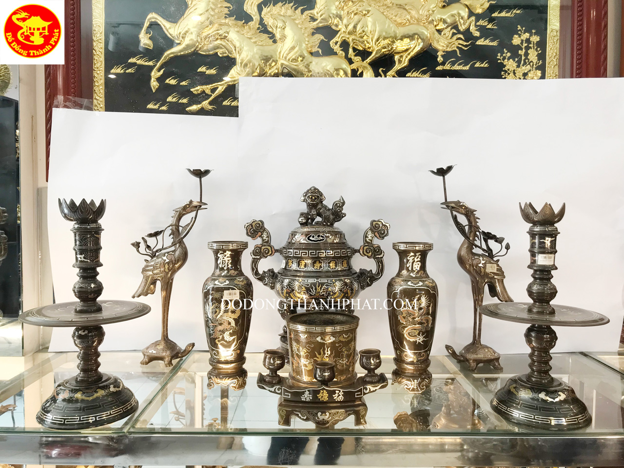 - Bộ đồ thờ cúng bằng đồng khảm ngũ sắc 50 khảm vàng bạc đồng cao cấp phù hợp với ban thờ dài 1,55 m rộng 0,81 m.