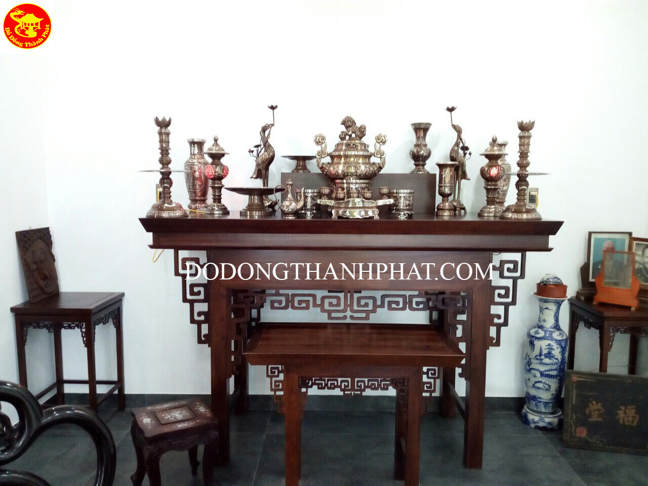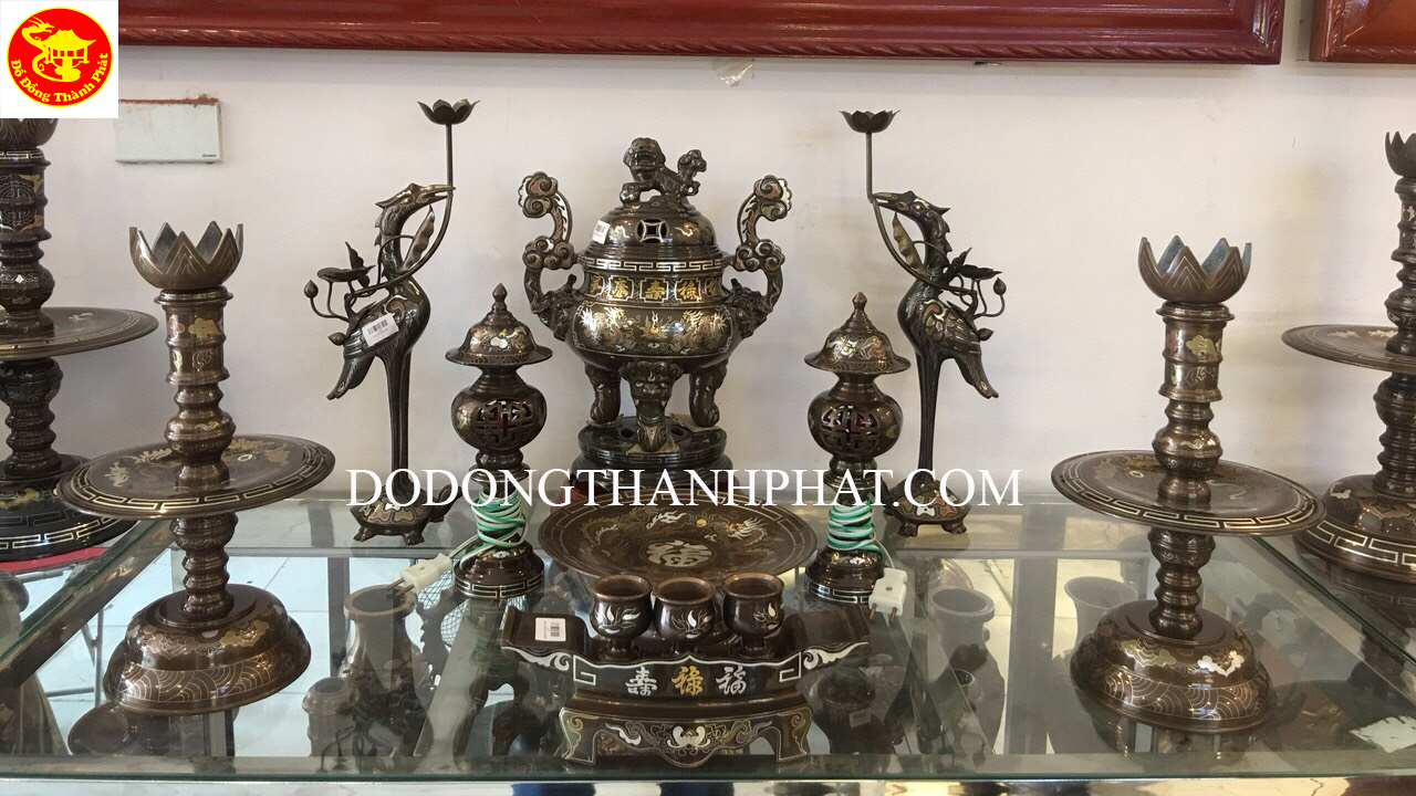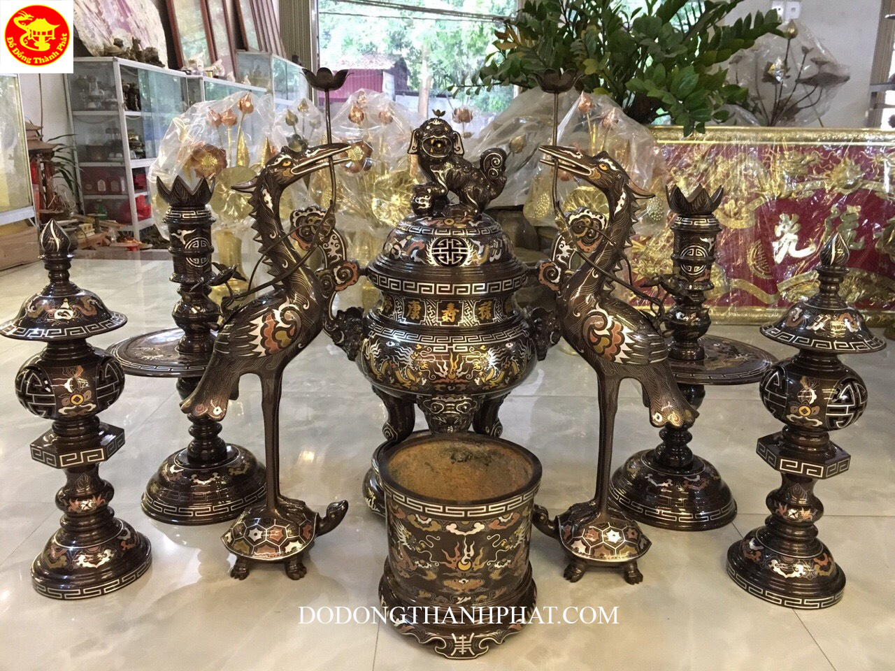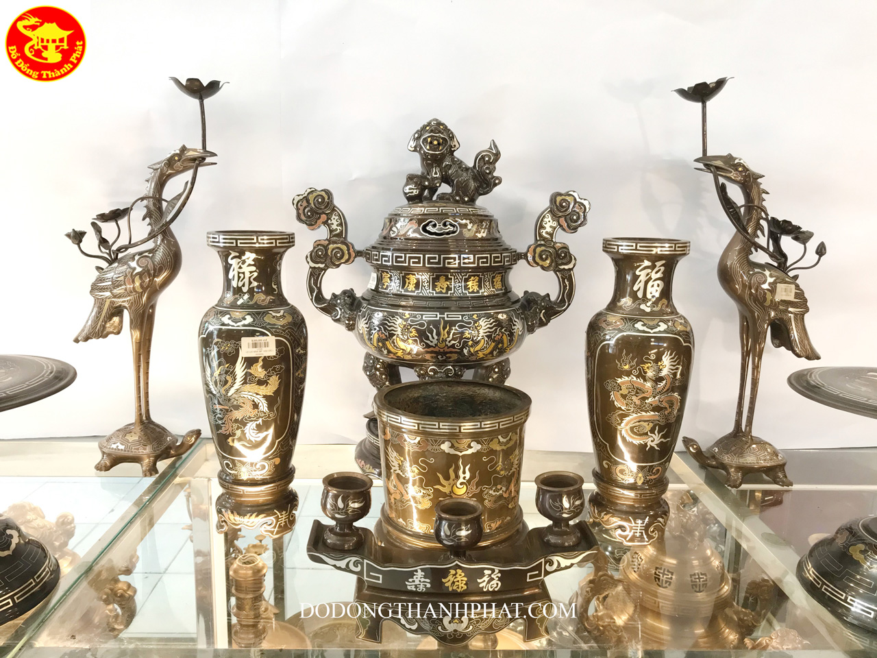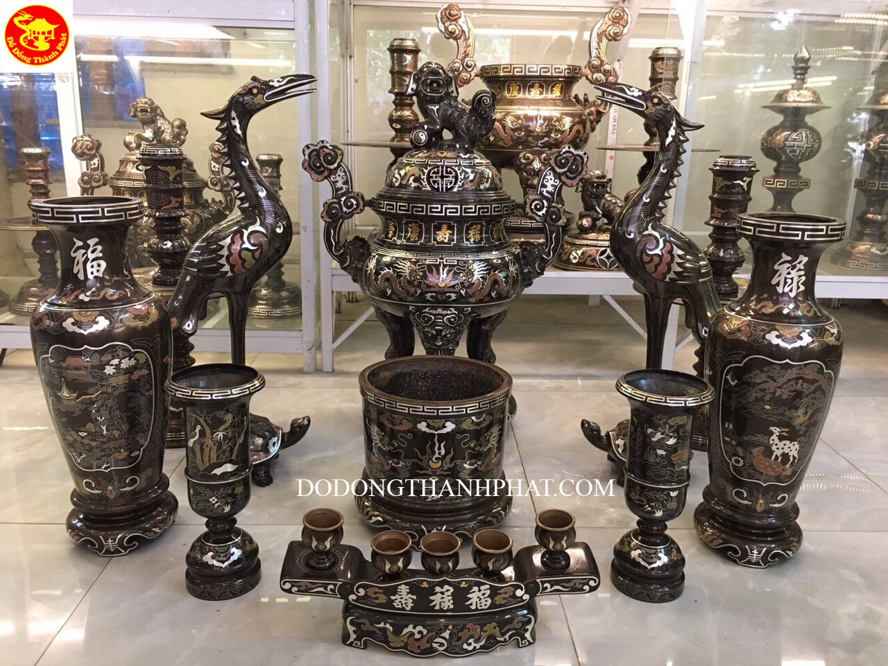 - Bộ đồ thờ cúng bằng đồng khảm ngũ sắc 50 khảm vàng bạc đồng cao cấp phù hợp với ban thờ dài 1,55 m rộng 0,81 m.