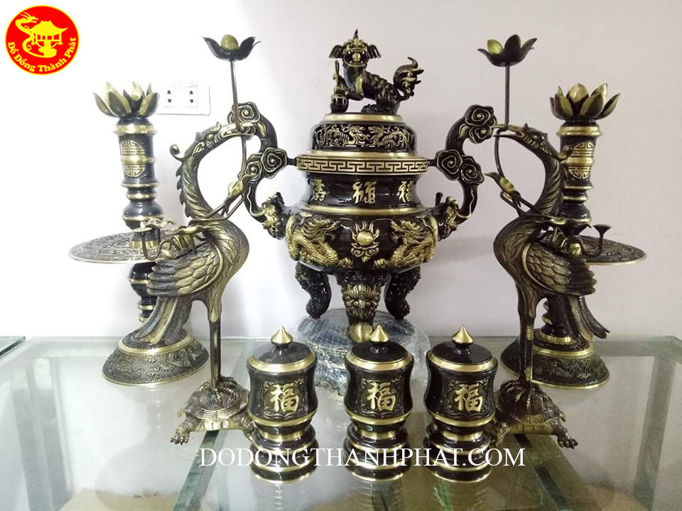 Bộ đồ thờ cúng bằng đồng hun giả cổ cọ sáng với mẫu song long trầu nguyệt bộ đồ thờ cúng bằng đồng gồm 11 món đỉnh đồng 60 song long trầu nguyệt, đôi hạc đồng, chân đèn đồng, mâm bống , bộ đài 3 quả với kích thước cao 60 bộ đồ thờ đầy đủ này phù hợp với ban thờ gia tiên dài 1,97 m rộng 81 tới 1,07 m quý khách gọi ngay: 0963523786.