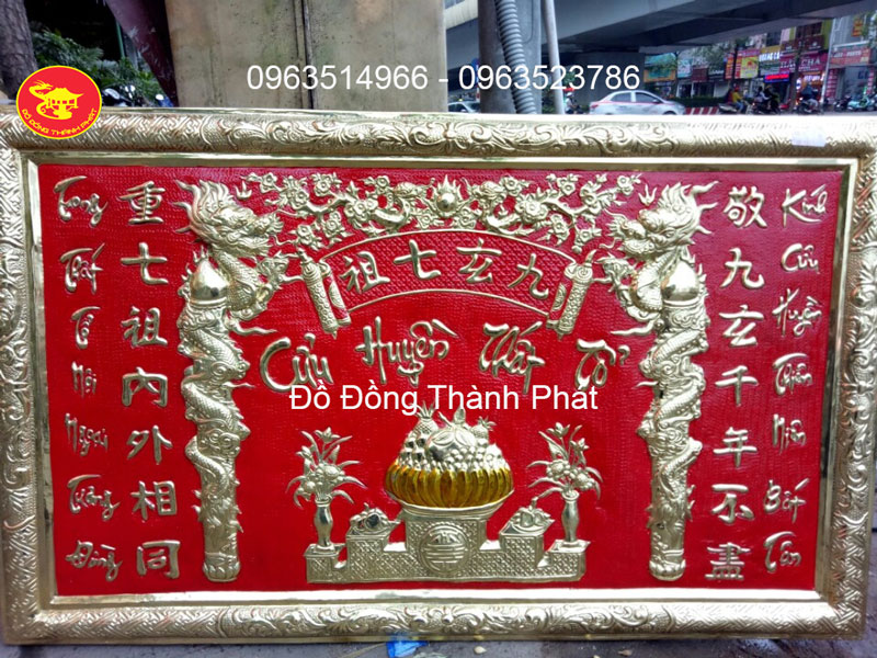 Mẫu cửu huyền thất tổ bằng đồng thờ gia tiên kích thước dài 1,27m, rộng 81cm. Chúng tôi còn có nhiều mẫu mã khác với các kích thước khác như dài 1,27 m, rộng 87 cm, dài 1,2 m rộng 80 cm, 80 x 80 cm. Nếu khách hàng có nhu cầu các bức có kích thước lớn hơn để bày trí tại không gian thờ nhà thờ họ lớn thì có thể đặt làm tại đồ đồng Thành Phát, chúng tôi sẽ làm theo yêu cầu của khách hàng và thời gian để chúng tôi hoàn thành sản phẩm này là khoảng 7 đến 10 ngày.