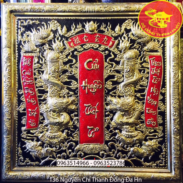 Với mẫu bài vị cửu huyền thất tổ chữ quốc ngữ, các nghệ nhân đồ đồng Thành Phát đã thúc thủ công trên tấm đồng vàng nguyên tấm dày 1 ly nhập khẩu Hàn Quốc. Chỉnh giữa là bài vị cửu huyển thất tổ thể hiện cho tổ tiên của chúng ta từ nhiều đời trước, xung quanh là rồng uốn lượn, với 2 câu đối hoàn chỉnh 2 bên. Bài vị được chế tác tạo viền khung xung quanh, phía sau là khung inox 304 chắc chắn