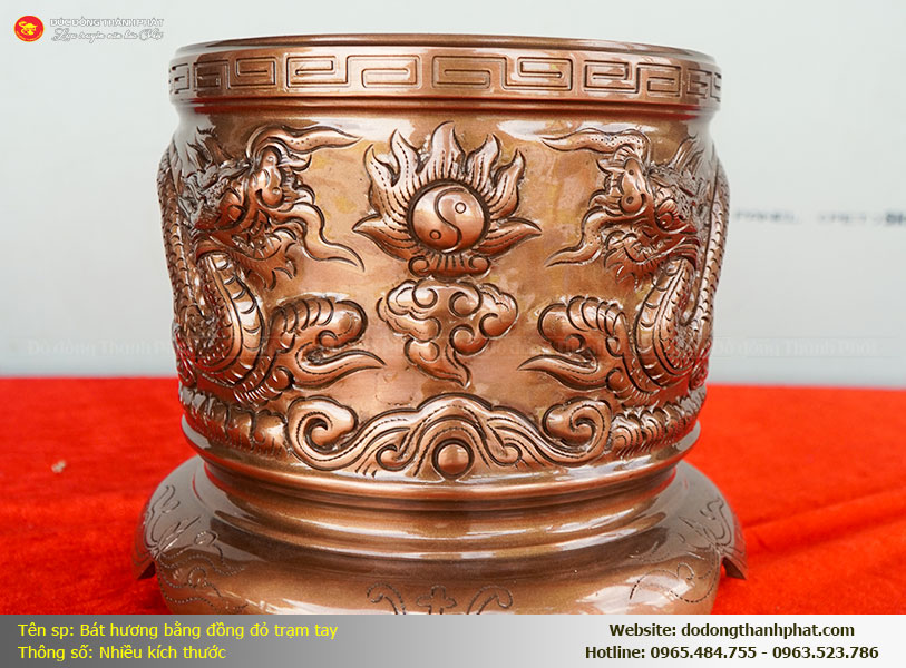 Bên cạnh đó, nghệ thuật chạm khảm thủ công họa tiết Long Phượng chầu mặt nguyệt hay Hoa Sen thanh cao (như các bác thấy rất rõ độ tinh xảo trong các ảnh thực tế) trên nền đồng đỏ không chỉ phô diễn tài hoa của nghệ nhân Thành Phát mà còn gửi gắm những ước vọng về quyền uy, sự bảo hộ và cuộc sống an nhiên, tự tại. Chọn bát hương đồng đỏ nồi hè là cách các bác khẳng định gia phong nề nếp, một tấm lòng hiếu đạo vẹn tròn và một sự đầu tư bài bản cho chốn đi về của linh hồn cha ông mai sau.
