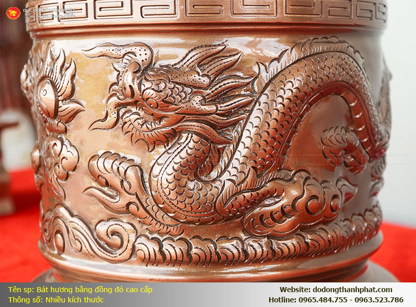 Việc thỉnh một bát hương bằng đồng đỏ không chỉ mang lại vẻ đẹp bề thế cho gian thờ mà còn giải quyết được nỗi lo lớn nhất của các bác về độ bền vĩnh cửu. Khác với những chất liệu dễ nứt vỡ hay xỉn màu theo thời gian, chất liệu đồng đỏ nguyên chất mang trong mình một sức sống bền bỉ, càng thờ lâu, sắc đồng càng xuống màu thâm trầm, tạo nên một vẻ đẹp cổ kính và uy nghiêm vô song. Mỗi khi thắp nén tâm hương, nhìn vào họa tiết Rồng chầu Mặt Nguyệt tỏa sáng trong khói trầm, các bác sẽ cảm nhận được sự ấm cúng, thanh tịnh và một sợi dây kết nối vô hình nhưng vô cùng mạnh mẽ với cội nguồn. Chính vì vậy, bát hương đồng đỏ Thành Phát luôn được các bác sành sỏi lựa chọn như một cách để khẳng định gia phong và sự chỉn chu tuyệt đối trong việc thờ tự gia tiên.