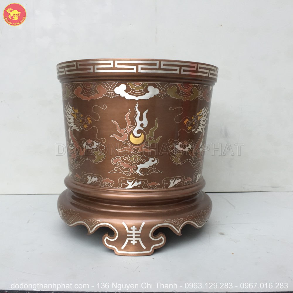 Chi tiết nổi bật: Được đúc bằng đồng đỏ nguyên chất cao cấp rất tỉ mỉ, sau đó được mang đi khảm thủ công với các đường dãnh hoa văn chìm. Trước mặt bát hương là hình ảnh song long trầu nguyệt được khảm rất tinh xảo và cân đối. Là sản phẩm đồ thờ bằng đồng cao cấp được tạo bằng ngũ sắc bao gồm " vàng, bạc, đồng xanh, đồng đỏ, đồng đen " khiến cho bát hương được bóng bẩy và sang trọng hơn.