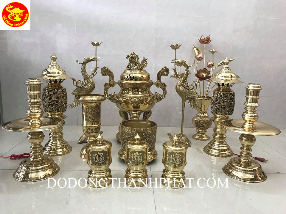 - Bao gồm: 01 đỉnh đồng, 02 hạc ngậm hoa sen, 02 chân nến, 02 đèn thờ, 02 lọ lộc bình, 01 bộ chén đựng nước, 01 đĩa lớn đựng hoa quả, 01 nậm rượu