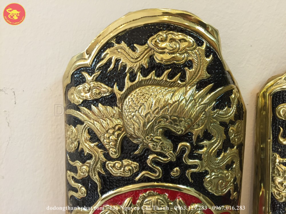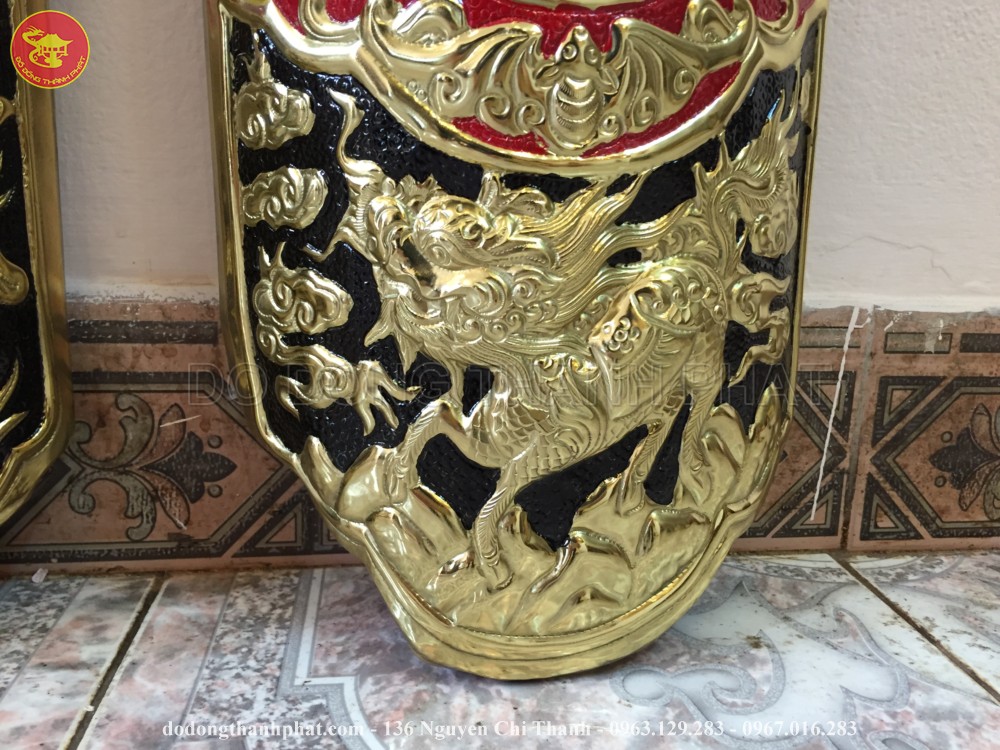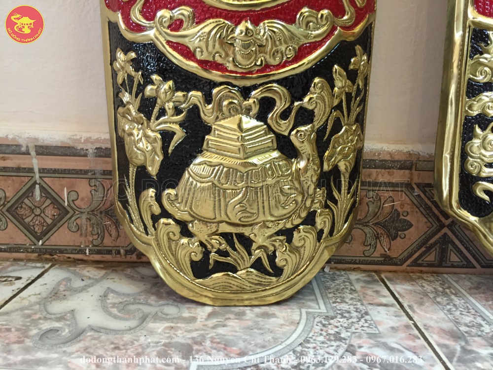 Ở bốn góc của đôi câu đối là hình ảnh linh vật tứ linh: " Long Lân Quy Phụng " được khảm nổi bật lên trên bằng đồng vàng.