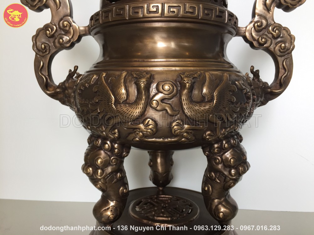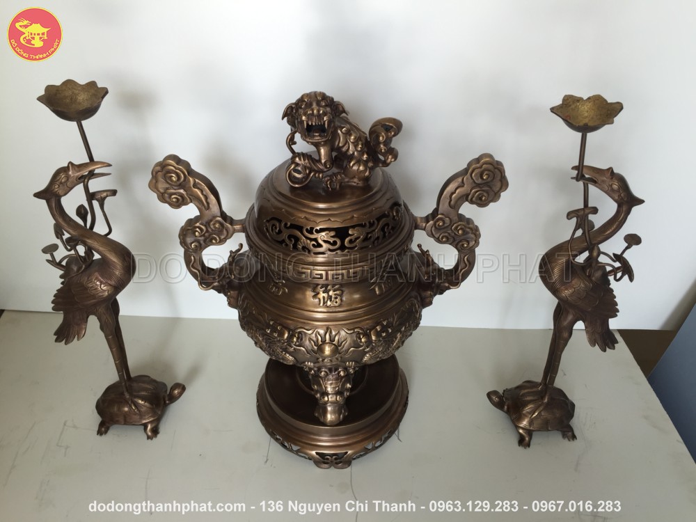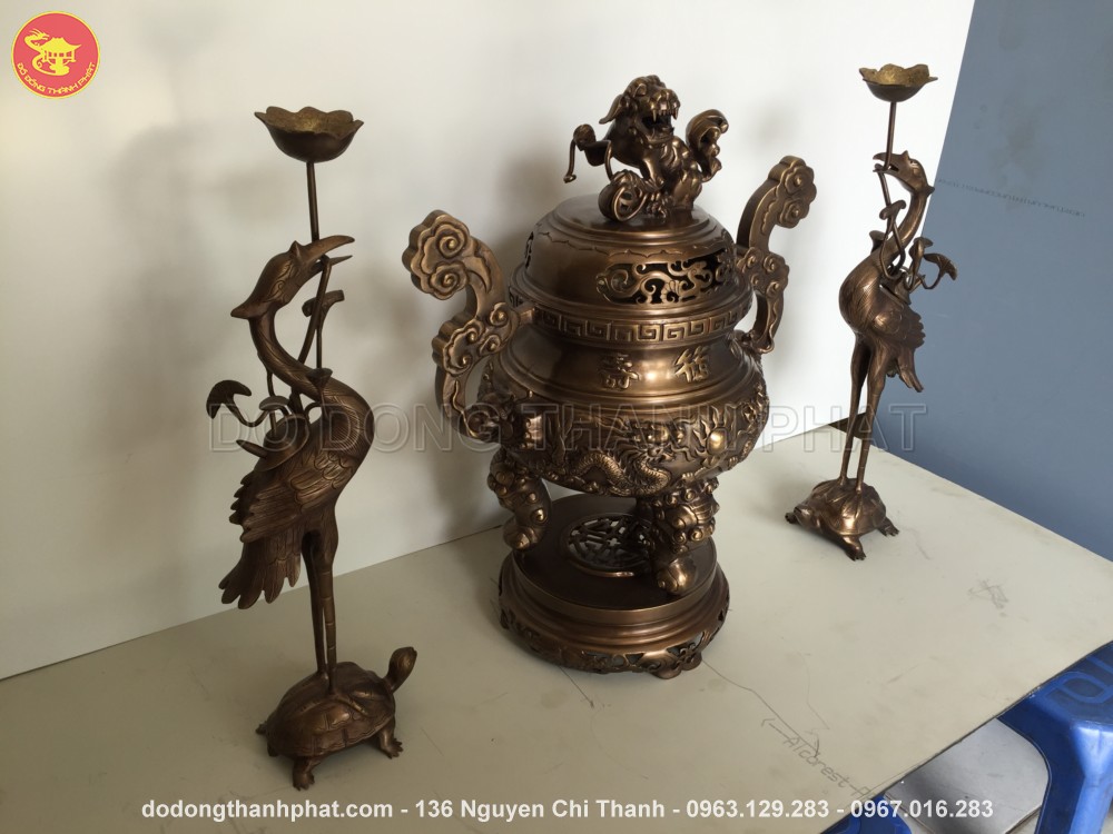 Bộ đồ thờ bằng đồng tam sự đỉnh hạc long phụng giả cổ đồng hun bao gồm đỉnh đồng, đôi hạc đồng và những vật dụng thờ cúng khác. Đỉnh đồng được các nghệ nhân đúc đồng Thành Phát khảm lên 3 chữ Hán Nôm " Phúc Lộc Thọ " và hình ảnh song long trầu nguyệt ở trước mặt tiền. Về phía mặt hậu là hình ảnh cặ phụng hoàng biểu tượng của sự đức hạnh, duyên dáng thanh nhã. Quan niệm người xưa cho rằng phụng hoàng là linh vật có thể điều hoà âm dương. Hai bên là hai hạc đồng đang đứng trên lưng rùa, một biểu tưởng của sự thanh nhã và trường thọ.
