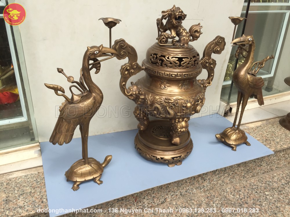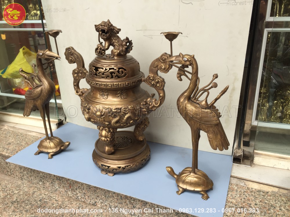 Bộ đồ thờ cúng bằng đồng tam sự đỉnh hạc long phụng giả cổ đồng hun bao gồm đỉnh đồng, đôi hạc đồng và những vật dụng thờ cúng khác. Đỉnh đồng được các nghệ nhân đúc đồng Thành Phát khảm lên 3 chữ Hán Nôm " Phúc Lộc Thọ " và hình ảnh song long trầu nguyệt ở trước mặt tiền. Về phía mặt hậu là hình ảnh cặ phụng hoàng biểu tượng của sự đức hạnh, duyên dáng thanh nhã. Quan niệm người xưa cho rằng phụng hoàng là linh vật có thể điều hoà âm dương. Hai bên là hai hạc đồng đang đứng trên lưng rùa, một biểu tưởng của sự thanh nhã và trường thọ.