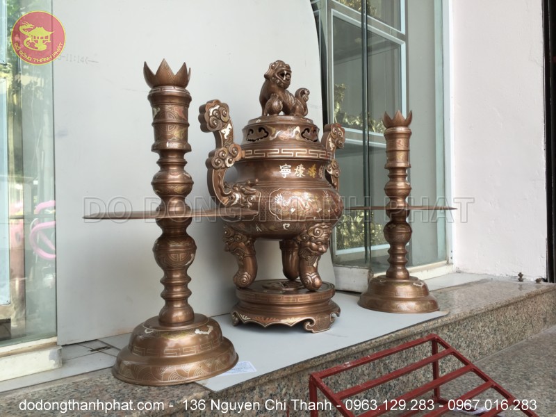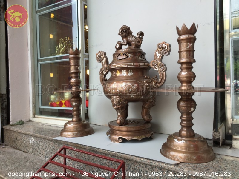 Bộ đồ thờ cúng bằng đồng tam sự đỉnh nến khảm ngũ sắc 1 chữ vàng 70 cm