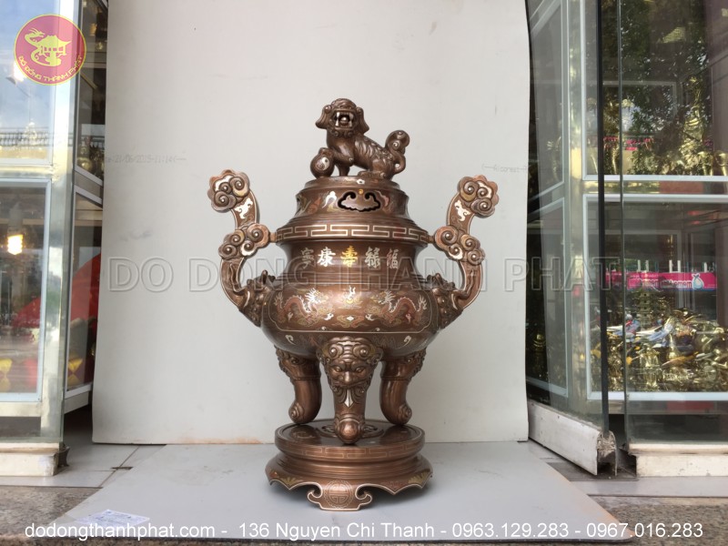 Đỉnh đồng được khảm ngũ sắc hoa văn long phụng chi tiết, tỉ mỉ bằng bạc và vàng 9999. Đỉnh cao 70cm tính tới nghê đồng, bao gồm cả chân đế.