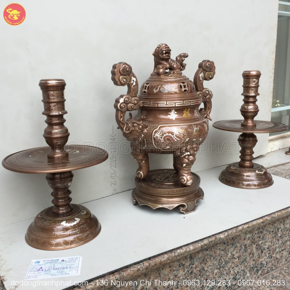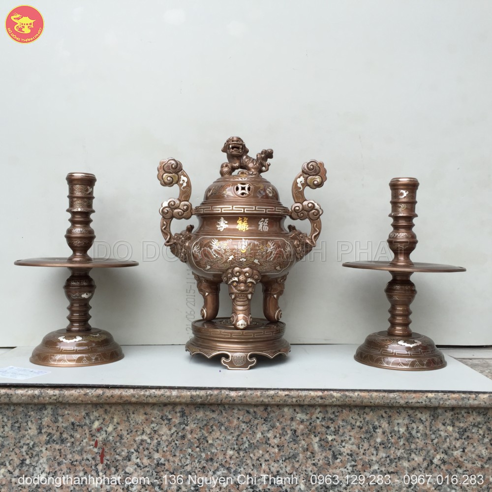 Bộ đồ thờ cúng bằng đồng tam sự đỉnh nến khảm ngũ sắc 1 chữ vàng cao 40 cm