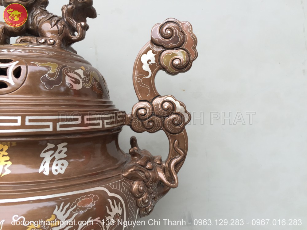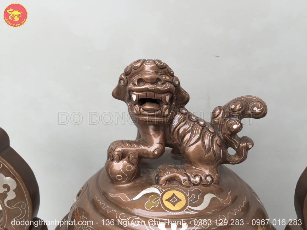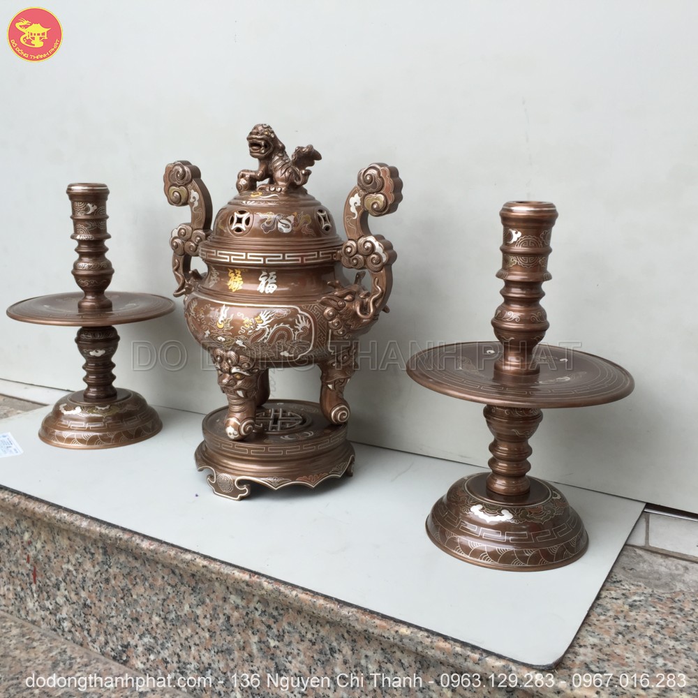 Chi tiết nổi bật: Bộ đồ thờ cúng bằng đồng tam sự đỉnh nến khảm ngũ sắc 1 chữ vàng được các nghệ nhân đúc đồng chạm khắc tinh xảo trên thân của đỉnh đồng gồm 3 chữa Phúc Lộc Thọ trong đó chữ Lộc được khảm vàng nguyên chất 9999. Bên cạnh đó là đôi chân nến đồng được đặt ở 2 bên đỉnh tạo nên sự huyền ảo lung linh trên bàn thờ.