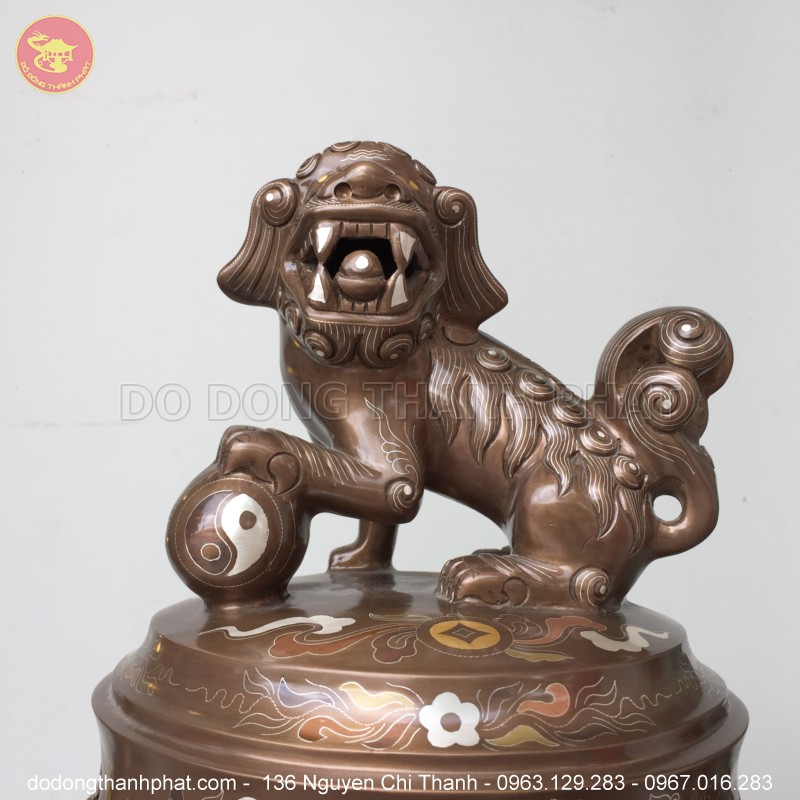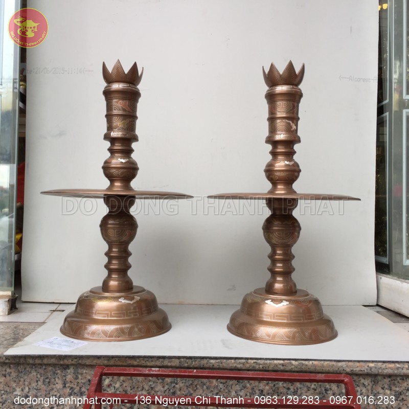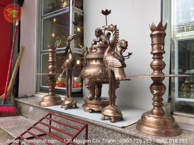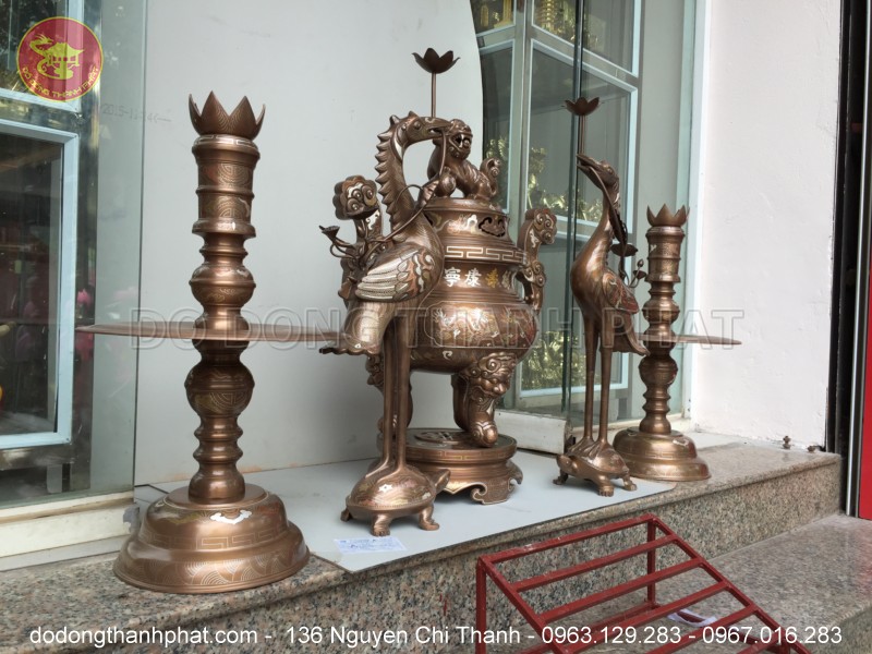 Chi tiết nổi bật: Bộ đồ thờ bằng đồng được khảm long phụng, tạc nghê đồng uy nghiêm. Trên đỉnh được khảm 5 chữ nôm thư pháp theo thứ tự Phúc – Lộc – Thọ - Khang – Linh trong đó có chữ Thọ được khảm bằng vàng 9999 và 4 chữ Phúc - Lộc – Khang - Linh được khảm bạc nguyên chất. Mặt sau 3 chữ Đức – Lưu – Quang được khảm bạc nguyên chất.
