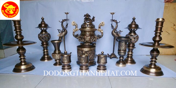 - Bộ đồ thờ cúng bằng đồng này phù hợp với ban thờ gia tiên có chiều ngang 1,27 tới 1,55 m chiều sâu ban thờ gia tiên 61 cm tới 81 cm.