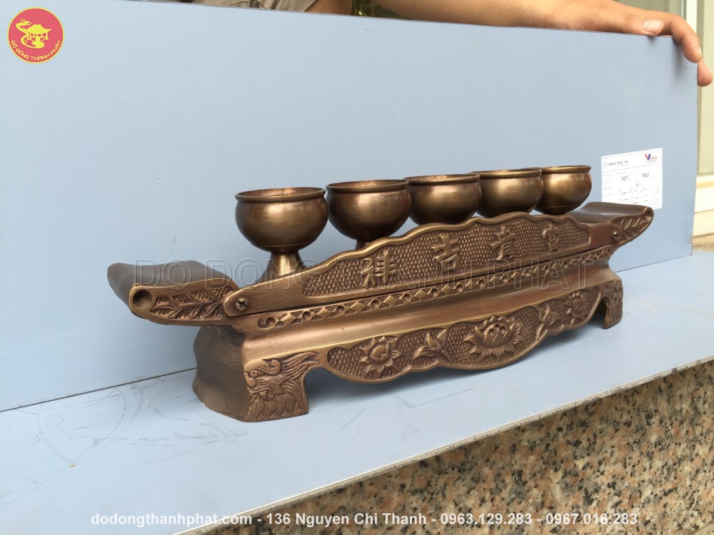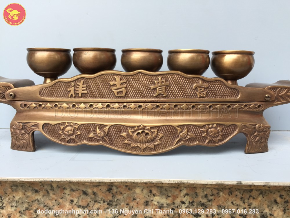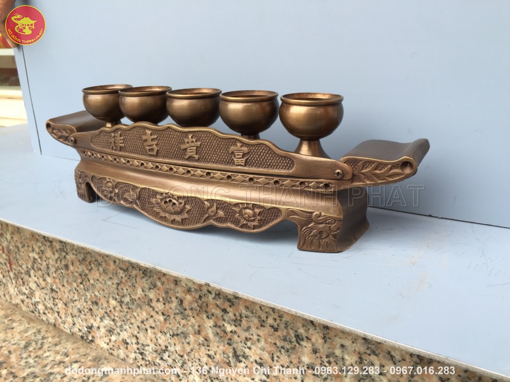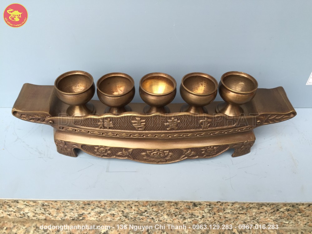 Ngai 5 chén là sản phẩm gồm đài thờ, khay chén bằng đồng được đặt trên bàn thờ gia tiên dùng để đựng nước được các nghệ nhân đúc đồng Thành Phát đúc thủ công bằng đồng thau hun xanh giả cổ. Bộ ngai 5 chén được chạm khảm các nét hoa văn lưỡng long trầu nguyệt rất tinh xảo và chi tiết. Trước mặt tiền của ngai được khảm 5 chữ Hán Nôm Phúc Lộc Thọ Linh Khang. Chính vì vậy mà nó còn được xem như là một trong những bộ đồ thờ cúng bằng đồng được nhiều người ưa chuộng nhất 2017