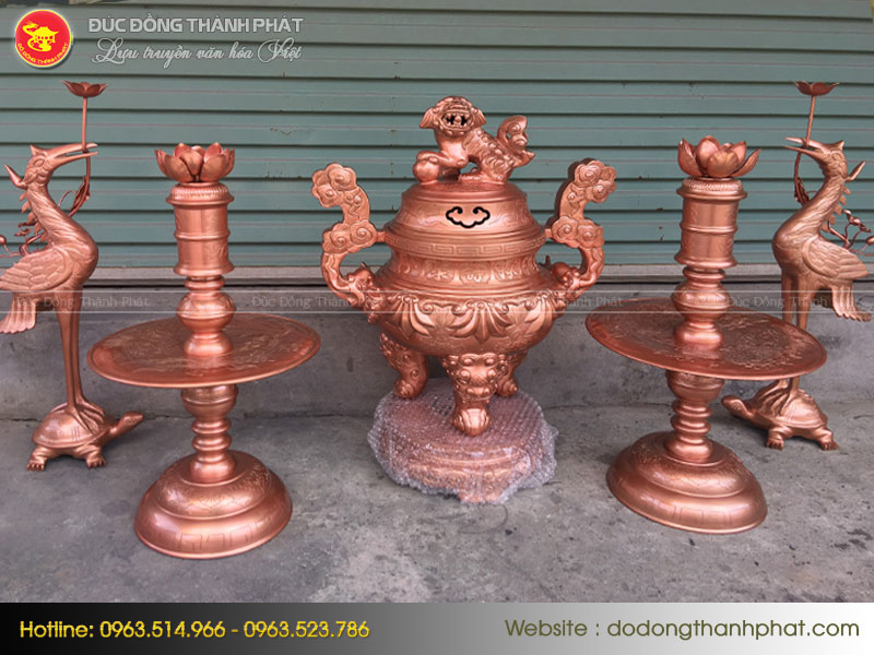 Đồ đồng Thành Phát xin giới thiệu Bộ sản phẩm gồm 5 món: 1 đỉnh đồng (hay còn gọi là lư hương), 2 chân nến dùng để thắp nến, 2 hạc, tuy nhiên tùy vào điều kiện của từng gia đình và diện tích bàn thờ, quý khách có thể bày thêm bát hương, đèn thờ, chùm sen,....