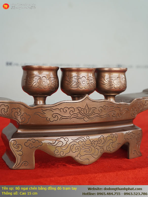 Bộ ngai chén gồm 3 chiếc, được đúc hoàn toàn từ đồng đỏ nguyên chất, mang đến vẻ đẹp trang nhã và sang trọng. Mỗi chiếc ngai chén được thiết kế tinh xảo, với các chi tiết chạm khắc tỉ mỉ, thể hiện sự khéo léo và tài hoa của các nghệ nhân. Sự kết hợp giữa chất liệu cao cấp và thiết kế độc đáo tạo nên bộ ngai chén không chỉ đẹp mắt mà còn bền bỉ, trường tồn với thời gian. Bộ ngai chén này là biểu tượng cho sự tôn kính và lòng thành kính dâng lên tổ tiên, góp phần làm cho không gian thờ cúng thêm phần trang nghiêm và linh thiêng.