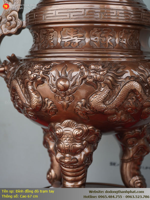 Đỉnh song Long chầu Nguyệt được đúc từ đồng đỏ nguyên chất, cao 67cm, là một tác phẩm nghệ thuật tinh xảo. Đỉnh có thiết kế truyền thống với nắp đỉnh mang hình Nghê vờn cầu, biểu tượng cho sự bảo vệ và uy quyền. Thân đỉnh được chế tác tinh xảo, nổi bật với họa tiết Song Long Chầu Nguyệt, mang ý nghĩa tâm linh sâu sắc. Phần cổ đỉnh chạm khắc chữ Phúc Lộc Thọ Khang Ninh, tượng trưng cho sự may mắn, tài lộc và sức khỏe. Thân đỉnh được đúc liền khối, với tai đỉnh được tạo hình vân mây cách điệu, và chân đỉnh được thiết kế hình đầu Nghê, tạo nên sự bền vững và mạnh mẽ. Đế đỉnh được đúc rời, trang trí với hoa văn tinh xảo, hoàn thiện một tác phẩm nghệ thuật độc đáo và trang trọng.