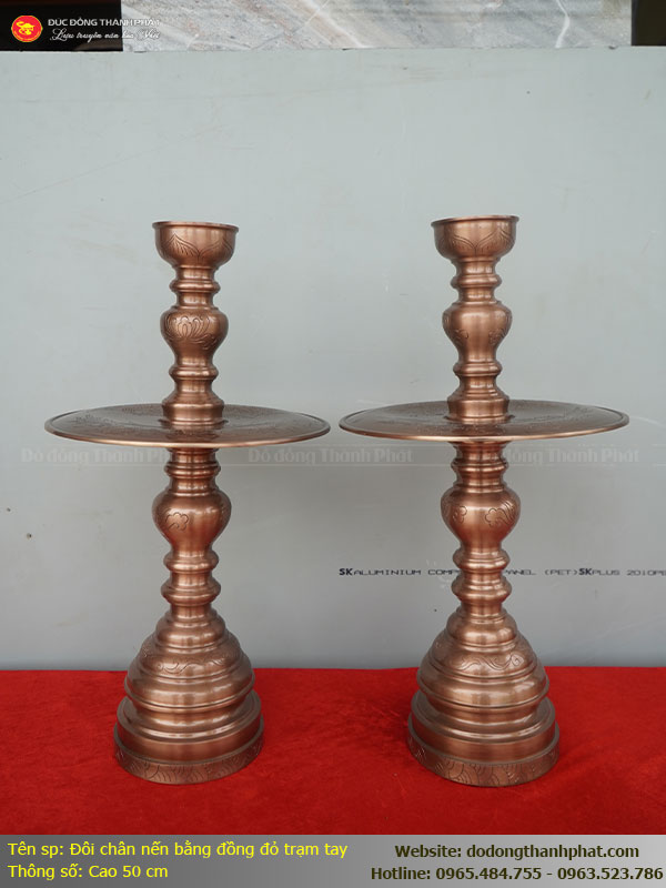 Đôi chân nến cao 50cm được chế tác tinh xảo từ đồng đỏ nguyên chất, mang thiết kế dạng ống tròn trơn với những đường thắt eo mềm mại và thanh thoát. Phía trên đỉnh nến là một bông sen bằng đồng, biểu tượng của sự thuần khiết và thanh cao. Thân nến và lá nến được chạm khắc tỉ mỉ với những họa tiết Rồng Phượng hoặc Tứ Linh, tạo nên vẻ đẹp uy nghi và trang trọng, đồng thời mang ý nghĩa phong thủy tốt lành.