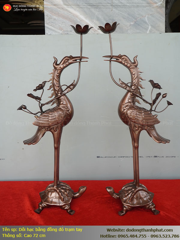 Đôi hạc thờ cao 72cm được chế tác theo dáng truyền thống, miệng ngậm bông sen và đứng vững vàng trên lưng rùa, biểu tượng cho sự kết hợp hài hòa giữa trời và đất. Thân hạc được chạm khắc tinh xảo, với từng đường nét mềm mại và uyển chuyển, tạo nên vẻ đẹp thanh thoát và cao quý. Mai rùa cũng được chạm khắc tỉ mỉ, tạo nên một tổng thể hài hòa và sắc nét, thể hiện sự trường thọ và vững bền. Sự kết hợp giữa hạc và rùa không chỉ mang giá trị thẩm mỹ cao mà còn chứa đựng ý nghĩa tâm linh sâu sắc, tượng trưng cho sự cao quý và trường tồn.