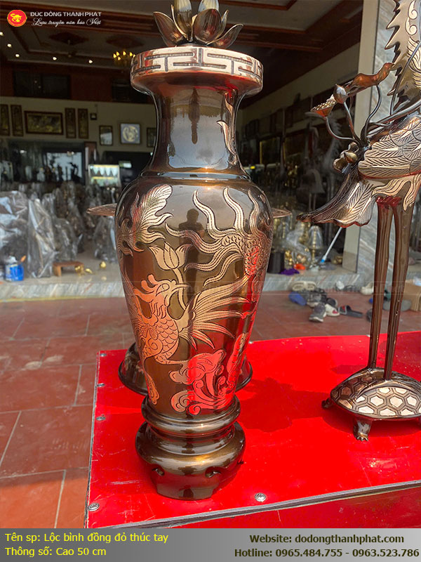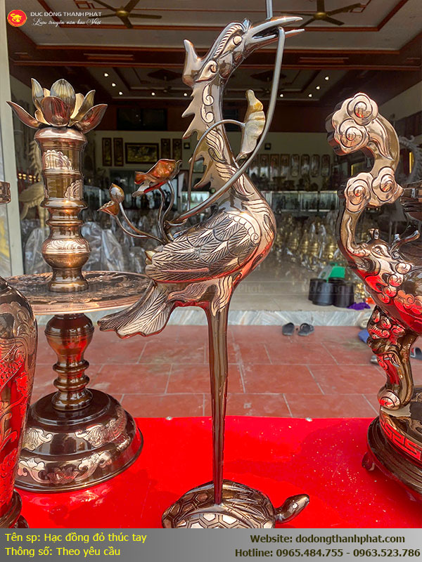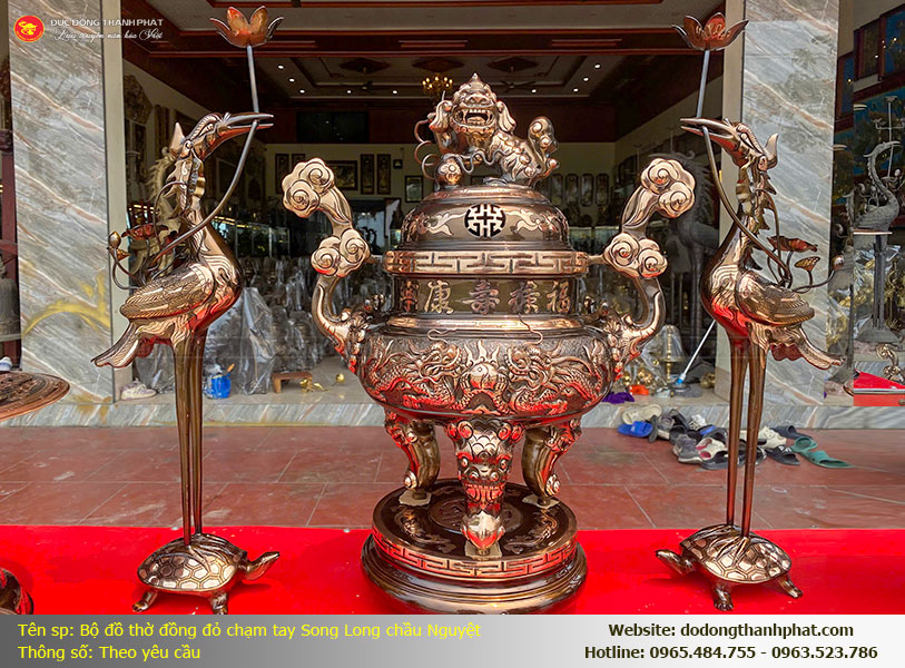 Khác biệt rõ rệt của đồ thờ Ngũ Sự bằng đồng đỏ so với các sản phẩm khác còn nằm ở sự “có hồn” – thứ cảm xúc khó diễn tả thành lời nhưng lại có thể cảm nhận rõ ràng khi đứng trước sản phẩm. Cái “hồn” ấy đến từ quá trình chế tác đầy tâm huyết, nơi mà từng họa tiết được người thợ chạm tay cẩn thận, nâng niu từng đường nét như thể đang thổi linh khí vào từng thớ đồng. Đó là nét vảy rồng uốn lượn, là hình dáng hạc đứng uy nghi trên lưng rùa, là hoa văn sen nở rộ – mỗi chi tiết đều được lựa chọn và thể hiện không chỉ bằng kỹ thuật mà còn bằng hiểu biết sâu sắc về văn hóa, phong thủy và tâm linh. Người thợ không chỉ làm ra một món đồ, họ đang kể một câu chuyện – câu chuyện về truyền thống, tín ngưỡng và cốt cách của dân tộc Việt Nam.