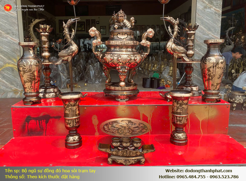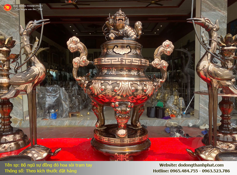 Một trong những điểm nổi bật và đáng tự hào nhất của sản phẩm chính là quy trình chế tác hoàn toàn thủ công. Những người nghệ nhân tại Thành Phát, với kinh nghiệm truyền đời và đôi tay lành nghề, đã trực tiếp thực hiện từng công đoạn – từ nấu đồng, tạo khuôn, đổ khuôn cho đến chạm khắc hoa văn. Mỗi chi tiết đều được chạm tay tỉ mỉ, sắc sảo đến mức có thể cảm nhận bằng mắt thường từng đường nét uốn lượn, từng họa tiết nhỏ nhất. Đây không phải là những sản phẩm được sản xuất hàng loạt bằng máy móc công nghiệp mà là từng tác phẩm độc bản mang đậm dấu ấn cá nhân của người nghệ nhân. Sự công phu và tâm huyết ấy khiến từng bộ Ngũ Sự không chỉ đẹp về hình thức mà còn ẩn chứa linh hồn văn hóa trong từng thớ đồng.