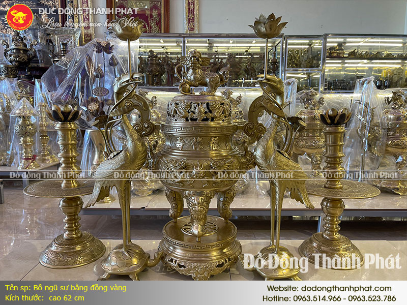 - Bộ ngũ sự này được làm từ đồng thau màu vàng thanh khiết, mang lại vẻ đẹp truyền thống và sang trọng.
