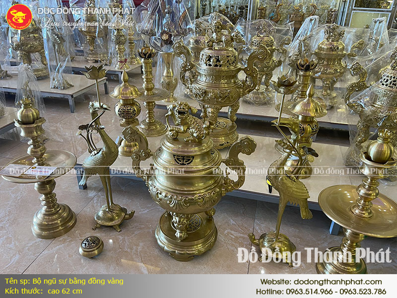 Bộ ngũ sự bằng đồng vàng cao 62 cm này là một thế mạnh trong ngành đúc đồ đồng thờ cúng của Đồ Đồng Thành Phát, chúng tôi tự hào là một trong những đơn vị đúc đồng uy tín trong cả nước. Đặt hàng ngay hôm nay và trải nghiệm sự đẳng cấp và tinh tế từ nghệ thuật đúc đồng thau.