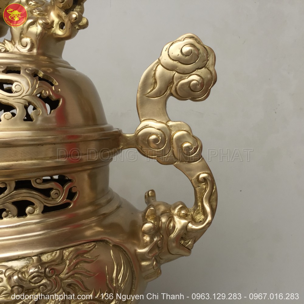 Chi tiết nổi bật: Đỉnh đồng được các nghệ nhân đúc thủ công rất sắc nét và tinh xảo hình song long trầu nguyệt ở mặt tiền. Mặt tiền hào quang bao nhiêu thì mặt hậu cũng không kém bấy nhiêu với đông long phụng đang vờn nhau quấn lấy thân đỉnh. Bên cạnh đó là cặp hạc đồng đứng trên thân rùa ngậm cành sen biểu tượng cho sự trường thọ, và thanh khiết. Hai bên hai chân nến đồng được chạm khảm với cái nét hoa văn vô cùng điêu luyện.