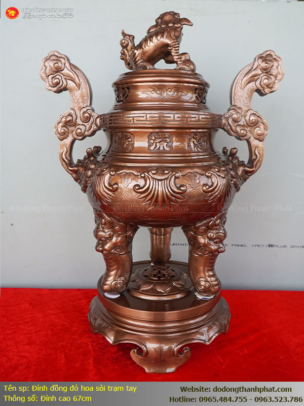 Lưu ý của em: Các bác nhớ quay mặt có chạm 3 bông hoa sòi ra phía trước. Nắp đỉnh có hình con Nghê phải hướng chính diện ra ngoài. Trong phong thủy, đỉnh đồng là nơi giáng ngự của tổ tiên, mùi trầm hương tỏa ra từ bụng đỉnh giúp thanh lọc uế khí, mang lại sự thanh tịnh cho cả ngôi nhà.