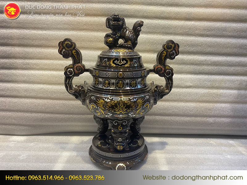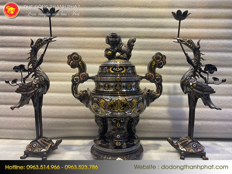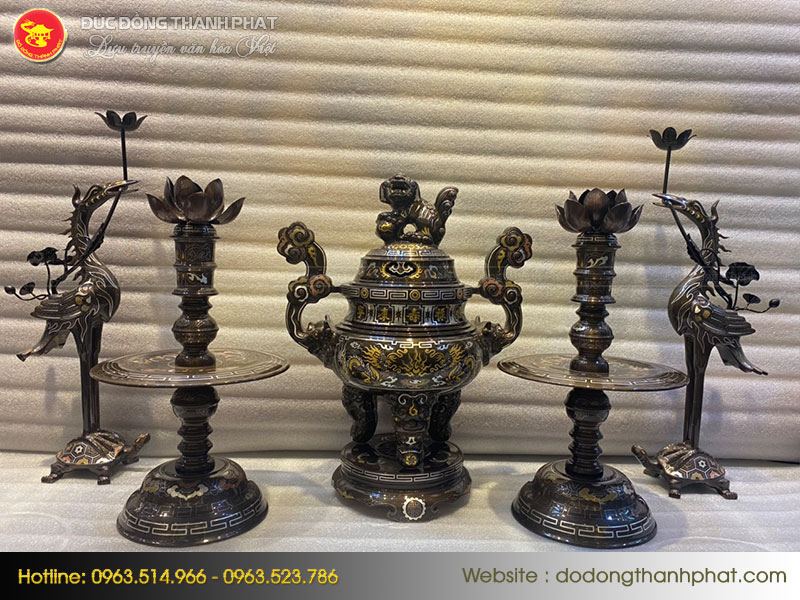 Bộ Ngũ Sự Khảm Ngũ Sắc gồm 1 Đỉnh Đồng 2 Hạc đồng và 2 Chân Nến được đúc thủ công, đúc bằng chất liệu đồng đỏ. Phôi đồng sau khi đúc được làm nguội xử lý bề mặt nhẵn bóng, được khảm thêm các kim loại quý như đồng đỏ, bạc lá, vàng 9999, đồng đen và đồng xanh vào bề mặt sản phẩm tạo ra các đường nét hoa văn với 5 màu sắc vô cùng độc đáo sang trọng, độ bền gần như không đổi theo thời gian.