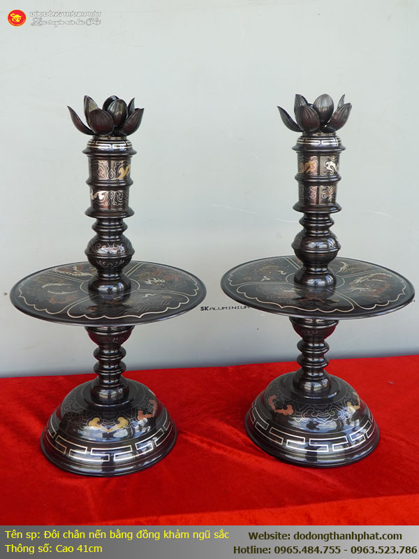 Bên cạnh đó, đôi chân nến cao 41cm đóng vai trò là "bệ đỡ" ánh sáng, hoàn thiện cấu trúc ngũ hành cho ban thờ. Với chiều cao 41cm (thuộc cung Đăng Khoa), chân nến thấp hơn đỉnh và hạc, tạo ra một sự phân cấp tầng lớp rõ rệt. Trong bài trí, việc vật phẩm có độ cao thấp nhấp nhô nhịp nhàng là vô cùng quan trọng để tránh sự đơn điệu. Đôi chân nến khảm Long Phụng sum vầy đặt ở hai góc ngoài cùng sẽ giúp mở rộng chiều ngang của bộ ngũ sự, làm cho ban thờ vốn nhỏ hẹp bỗng trở nên đầy đặn và ấm cúng hơn. Khoảng cách chiều cao 41cm cũng đảm bảo rằng khi các bác thắp nến, ngọn lửa sẽ không quá sát với cánh hạc hay đỉnh đồng, vừa đảm bảo an toàn hỏa hoạn, vừa giúp ánh sáng lan tỏa đều khắp, phản chiếu rực rỡ lên những đường khảm vàng, khảm bạc trên thân sản phẩm. Sự tương thích này giúp các bác dễ dàng bài trí thêm các vật phẩm phụ trợ như lọ hoa, mâm bồng mà không lo bị chồng chéo hay làm mất đi vẻ trang nghiêm của bộ ngũ sự chính.