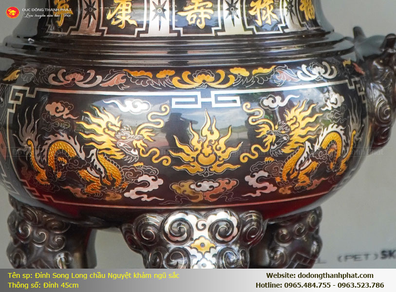 Sự tài hoa của người nghệ nhân Thành Phát còn nằm ở việc thể hiện thần thái của rồng trong một diện tích rất khiêm tốn. Khác với những bộ đỉnh lớn có nhiều không gian để tung tẩy nét vẽ, ở chiếc đỉnh 45cm này, mỗi sợi vàng bạc được đưa vào phải cực kỳ chuẩn xác, không được thừa cũng không được thiếu. Từng chiếc vảy rồng, từng sợi râu hay móng vuốt đều phải sống động như thật, thể hiện được sự dũng mãnh nhưng vẫn thanh thoát. Khi các bác nhìn ngắm kỹ, sẽ thấy đôi rồng như đang chuyển động giữa những tầng mây (khảm mây ngũ sắc), tạo nên một bức tranh phong thủy đầy sức sống ngay trên ban thờ gia đình mình. Sự hiện diện của đôi rồng khảm vàng 9999 trên nền đồng đỏ nồi hè còn mang ý nghĩa của sự giàu sang, phú quý và sự thăng tiến trong sự nghiệp cho con cháu. Màu sắc ngũ sắc gồm: vàng, bạc, đồng đỏ, đồng xanh (hoặc đen) và đồng vàng hài hòa với nhau tạo nên quy luật ngũ hành tương sinh ngay trên một vật phẩm, giúp cân bằng năng lượng hỏa của nhang nến và năng lượng mộc của ban thờ gỗ.