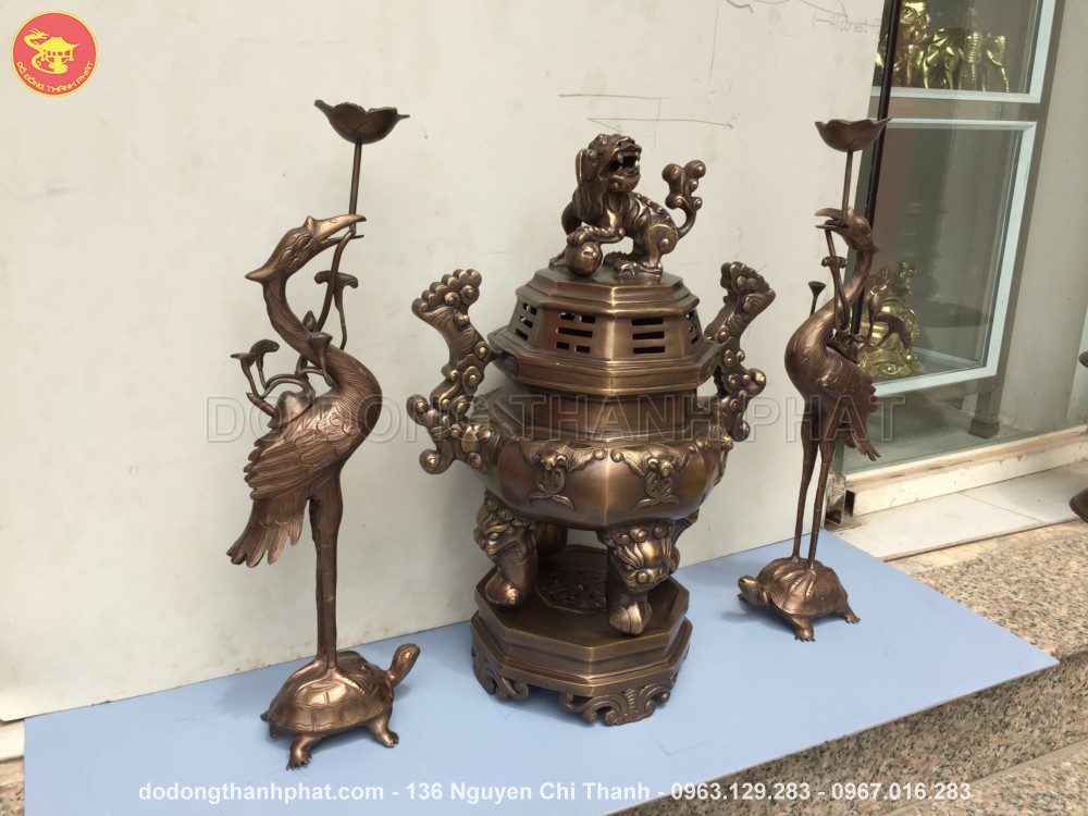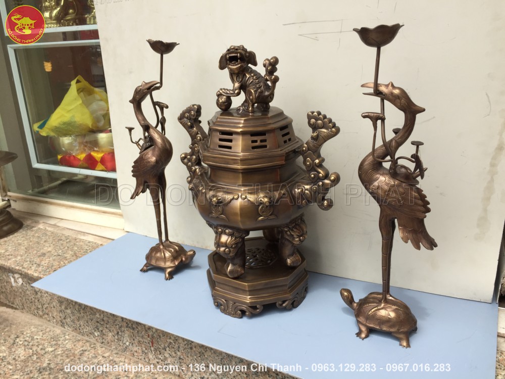 Bộ tam sự đỉnh hạc bát giác dơi phúc gồm có đỉnh đồng, đôi hạc đồng cao 60 cm. Ngoài việc tạo nên sự gia thế trên bàn thờ mà nó còn dùng để được đốt hương trầm thơm. Đỉnh đồng được các nghệ nhân đúc 8 cạnh mang hình dáng mới mẻ. Trên đỉnh còn được chạm khảm hình dơi phúc mang ý nghĩa tâm linh tài lộc đến với gia chủ. Ngoài ra là đôi hạc đồng ngậm cành sen đứng trên lưng rùa được gia công đánh bóng. Vì là bộ đồ thờ bằng đồng vừa mang giá trị tâm linh lại vừa mang hình dáng mẫu mã tinh tế nên bộ tam sự đỉnh hạc bát giác dơi phúc đang rất được ưa chuộng