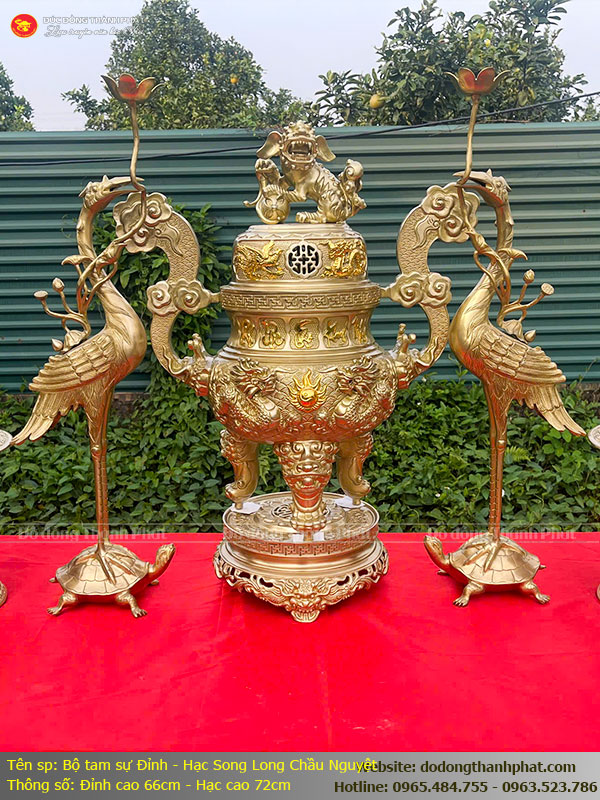 Bộ Tam Sự Đỉnh Đồng Song Long Chầu Nguyệt Và Đôi Hạc Thờ Cao 66cm – Tinh Hoa Tâm Linh Việt