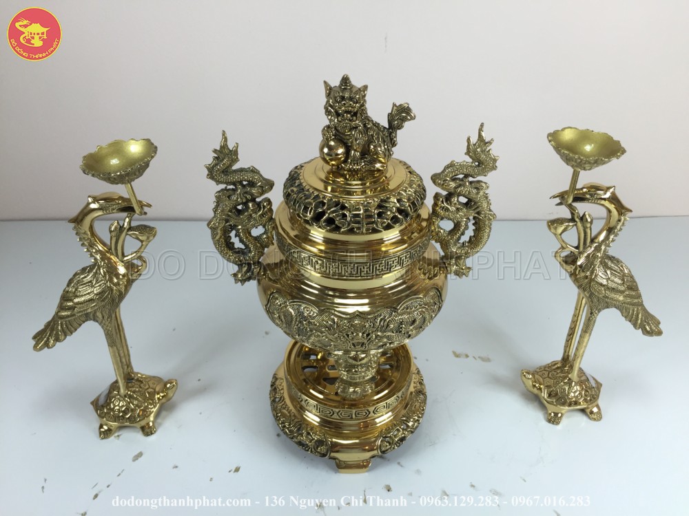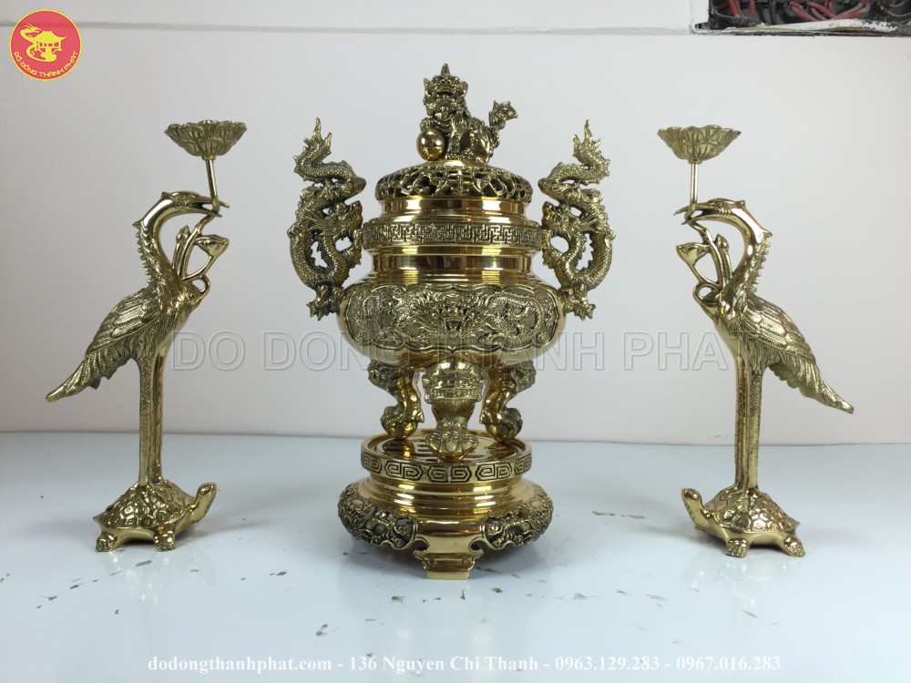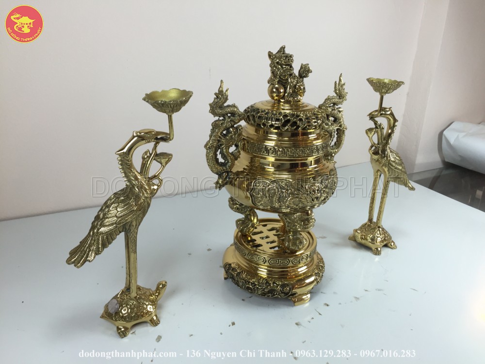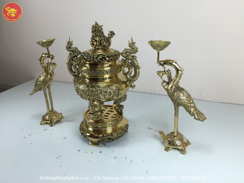 Tên đầy đủ: Bộ tam sự đỉnh hạc giao long bằng đồng vàng cao 25 cm