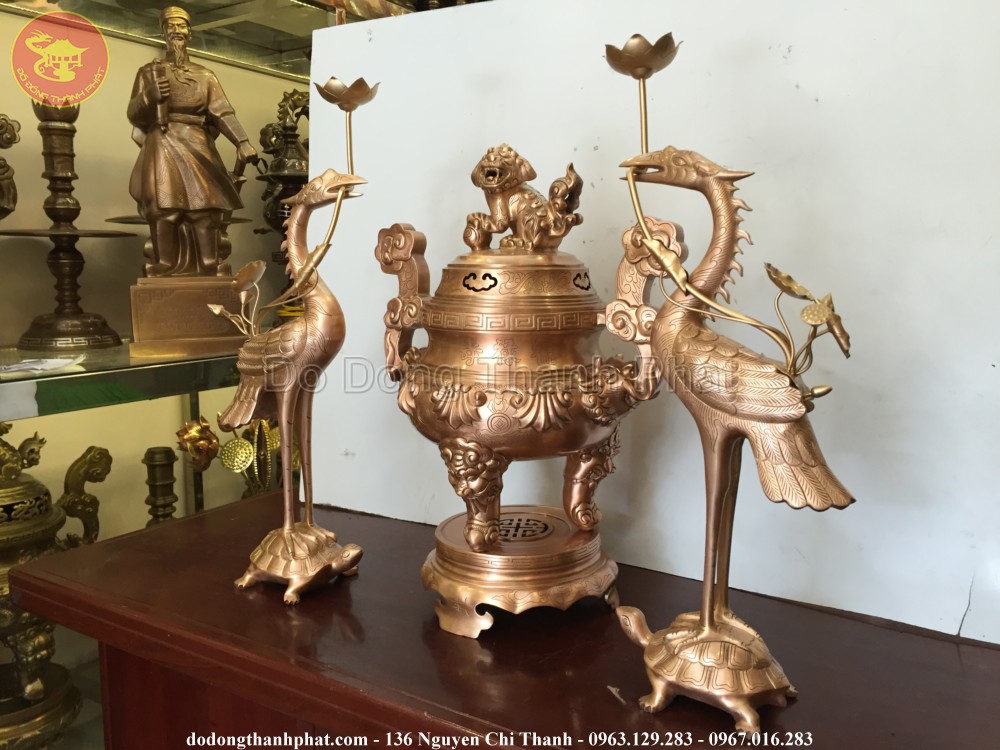 Tên đầy đủ: Bộ tam sự đỉnh hạc hoa sòi bằng đồng hun nâu giả cổ cao 55 cm