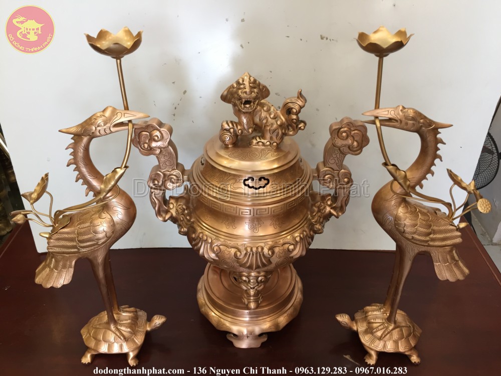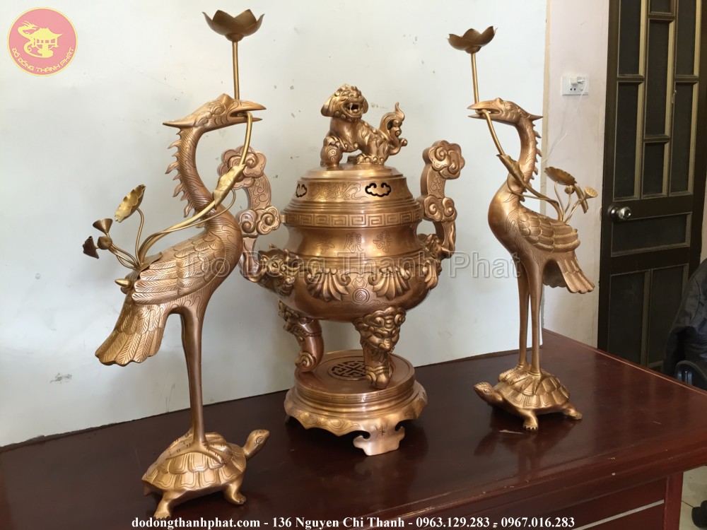 Bộ đồ thờ bằng đồng tam sự đỉnh hạc hoa sòi bao gồm đỉnh đồng, đôi hạc đồng mang những giá trị tâm linh. Đôi hạc đồng đứng trên lưng rùa có ý nghĩa thể hiện sự hoà hợp âm dương đất trời, hạc biểu tượng của thanh cao, tinh tuý, còn rùa là biểu tượng cho sư trường tồn bất diệt. Bộ tam sự đỉnh hạc hoa sòi là sản phẩm được làm rất tỉ mỉ và nhiều công đoạn khác nhau nên nó được đánh giá là bộ sản phẩm cao cấp.