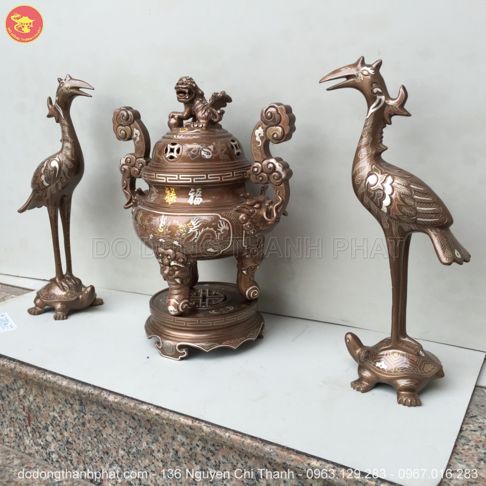 Chi tiết nổi bật: Bộ đồ thờ bằng đồng tam sự đỉnh hạc khảm ngũ sắc 1 chữ vàng có chiều cao 40 cm từ chân đỉnh đến nắp được đặt nghê đồng, một trong những linh vật dùng để chấn giữ gia trạch của gia đình. Tiếp đến cổ đỉnh được khảm ngũ sắc Phúc Lộc Thọ 1 chữ vàng nguyên chất 9999. Thân đỉnh đồng là đôi long phục uốn quanh trầu nguyệt được chạm khắc tinh xảo với những nét hoa văn của người nghệ nhân. Nói đến tam đỉnh hạc không thể không nhắc đến đôi hạc đồng đứng trên thân rùa, một biểu tượng của sự trường thọ và may mắn tạo nên vẻ đẹp của bộ tam sự.