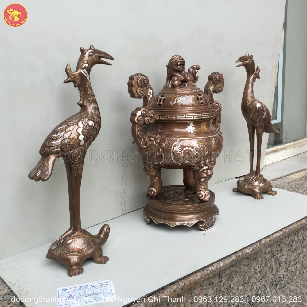 Bộ tam sự đỉnh hạc bằng đồng khảm ngũ sắc 1 chữ vàng cao 40 cm gồm: