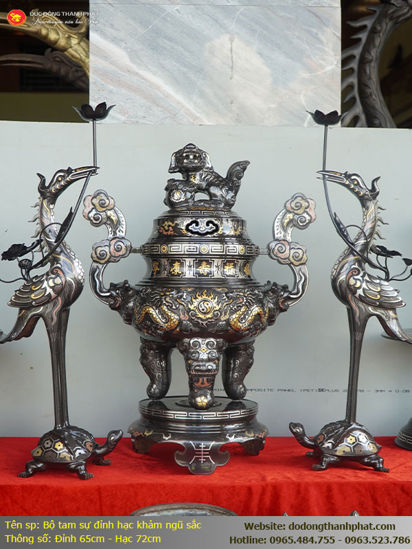 Bộ Tam Sự khảm ngũ sắc Đỉnh Song Long và đôi Hạc cưỡi Rùa (45-65-73)
