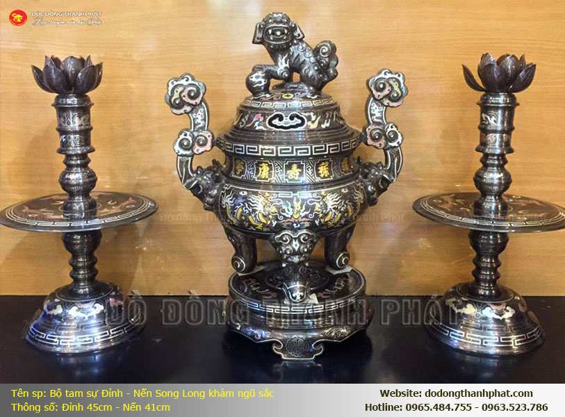 Đó chính là lý do vì sao bộ Tam Sự khảm ngũ sắc kết hợp giữa Đỉnh Song Long và đôi Chân Nến tại Đồ Đồng Thành Phát luôn giữ một vị thế đặc biệt. Nếu bộ Đỉnh Hạc mang lại vẻ thanh cao, thoát tục thì bộ Đỉnh Nến lại mang đến một cảm giác quyền quý, vững chãi và tràn đầy năng lượng hưng vượng. Sự kết hợp này là biểu tượng của sự giao thoa giữa sức mạnh tối thượng và ánh sáng trí tuệ, giúp xua tan những u tối và dẫn dắt phúc lộc về với gia đình.