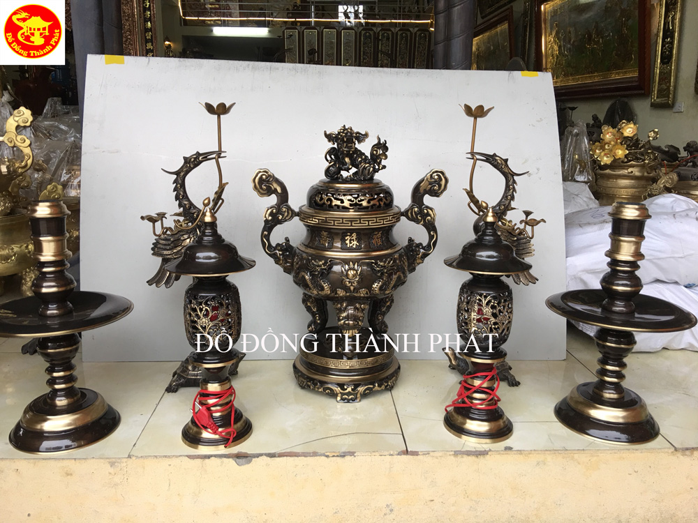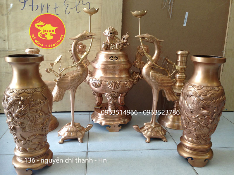 - Bao gồm: 01 đỉnh đồng, 02 hạc ngậm hoa sen, 02 chân nến, 02 đèn thờ