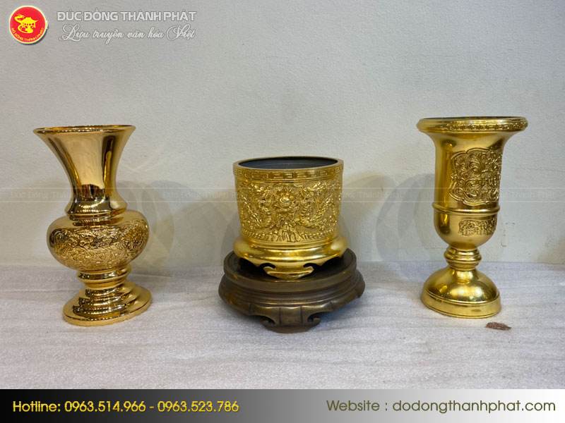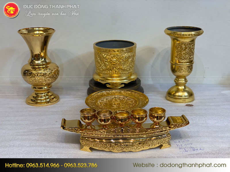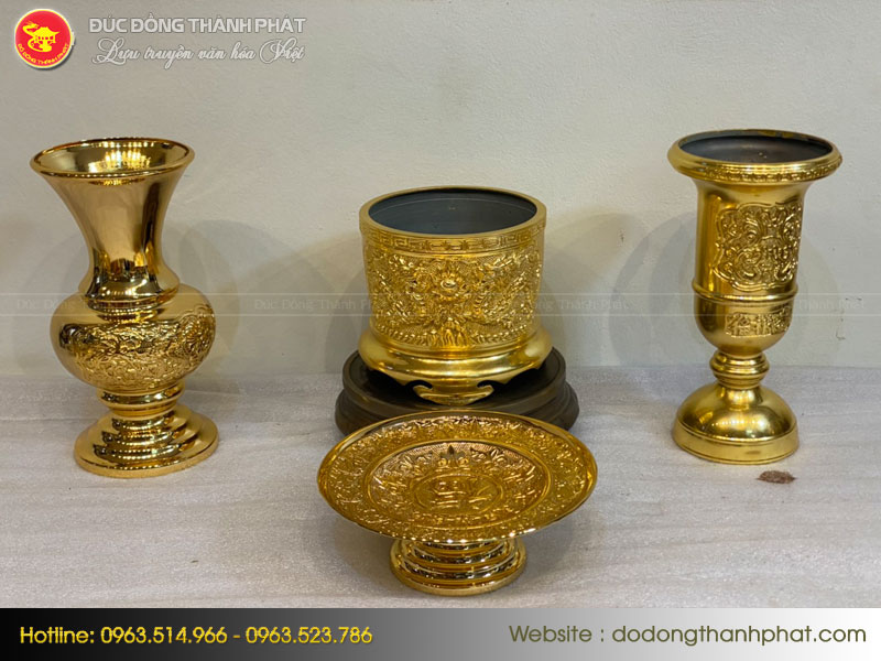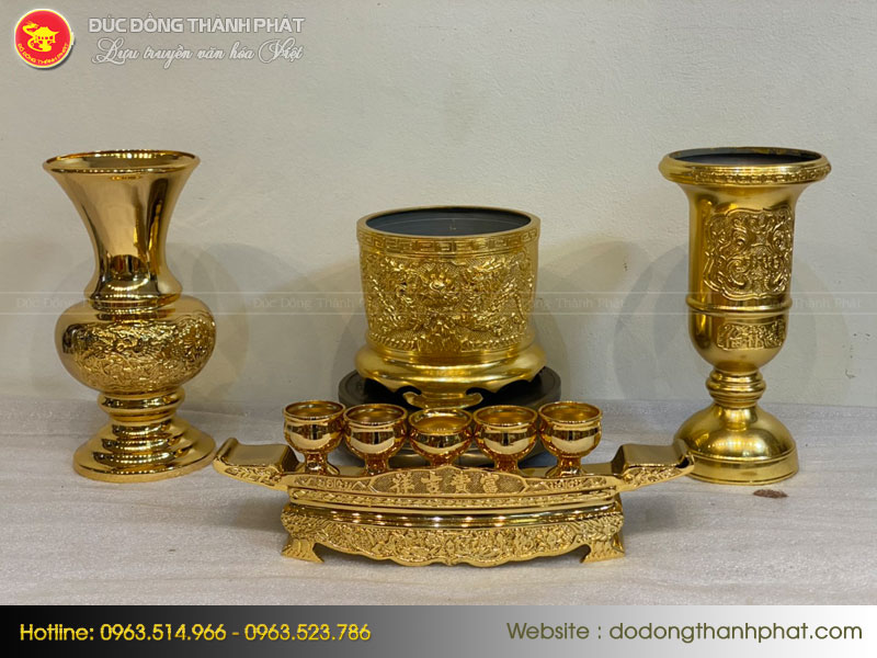 - Trọn bộ thờ bằng đồng mạ vàng 9999 bao gồm: Đỉnh đồng, bát hương, đôi hạc, đôi chân nến, đôi đèn rồng phụng, mâm đồng, ống hương, chén đựng nước...sản phẩm được đúc từ mẫu cổ xưa cổ kính, độc lạ, hiếm có, hoa văn trên sản phẩm gồm rồng, phượng con hạc, con ghê,...mang yếu tố tâm linh cao.