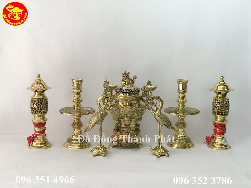 Bộ thờ cúng ngũ sự bằng đồng bao gồm đỉnh đồng , đôi hạc ,đôi chân nến đồng và một số vật dụng khác, được các nghệ nhân đúc đồng Thành Phát đúc thủ công công rất tỉ mỉ, chi tiết, và tinh xảo .