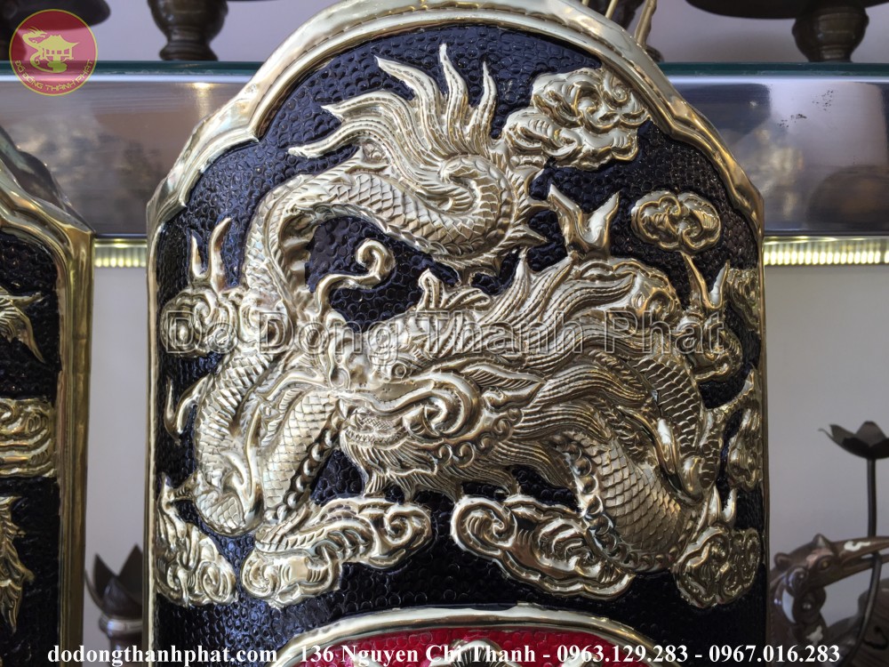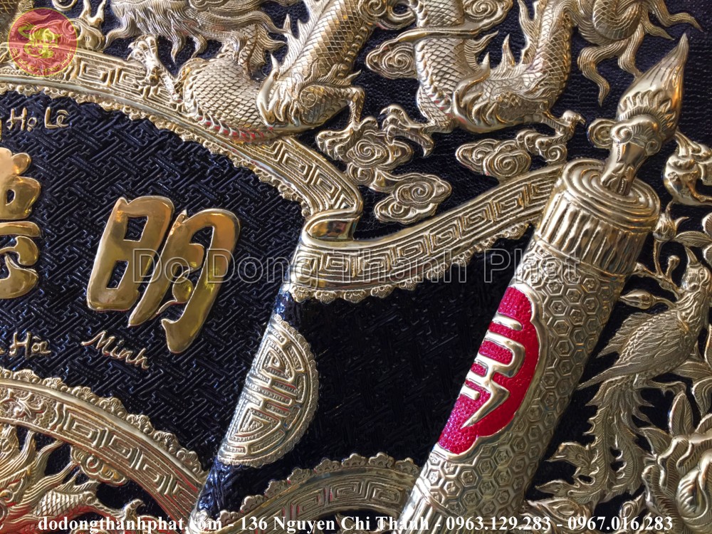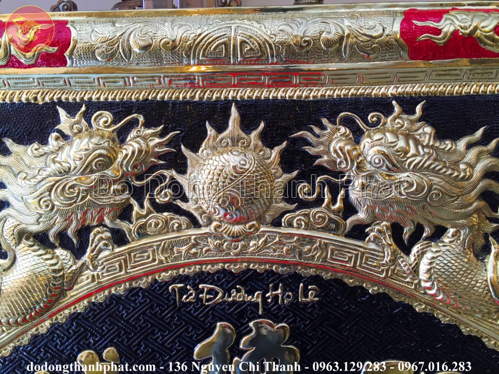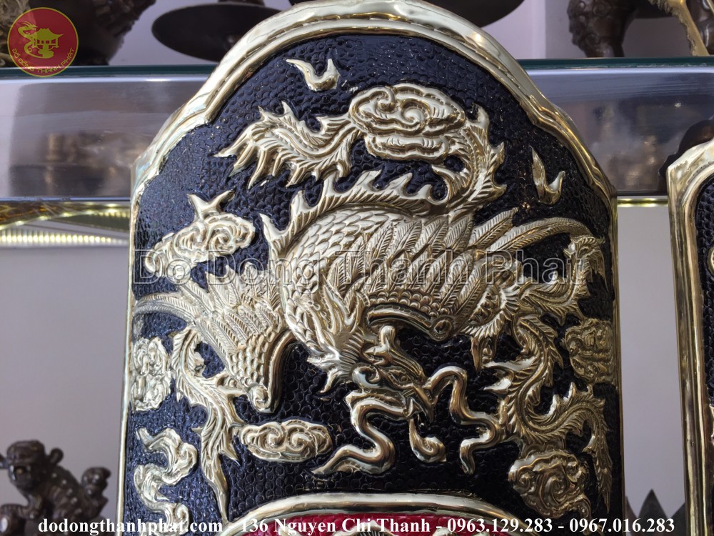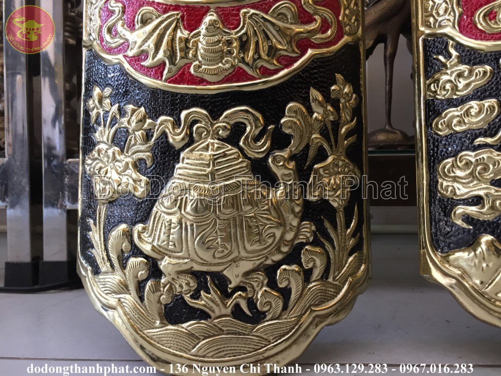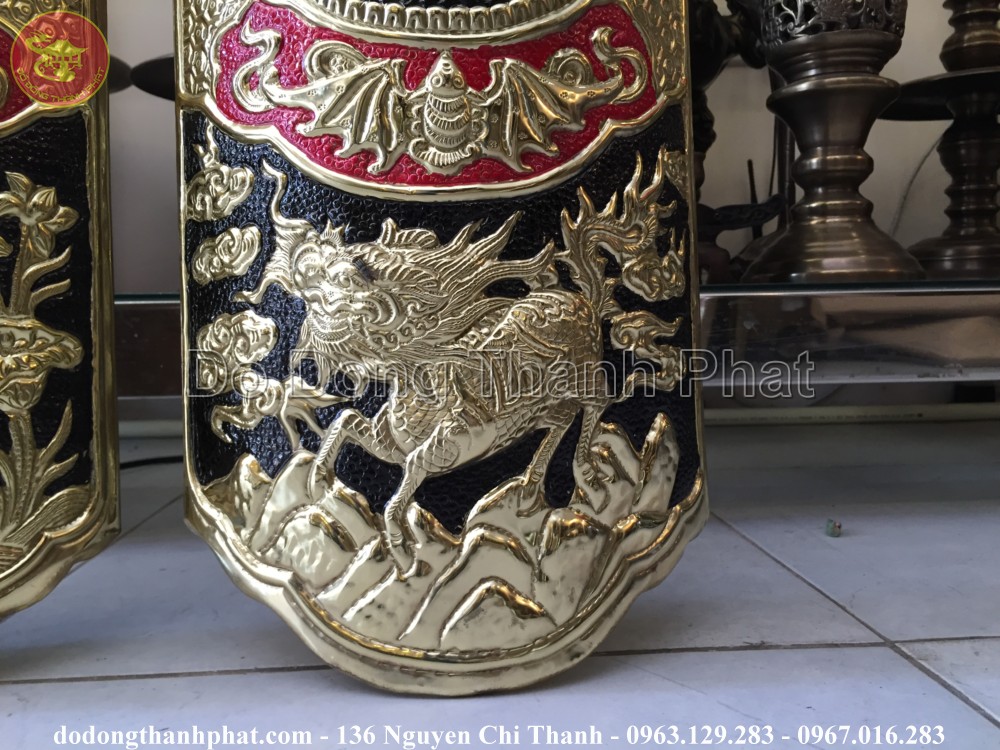 Ở bốn góc của đôi câu đối là hình ảnh linh vật tứ linh: " Long Lân Quy Phụng " được khảm nổi bật lên trên bằng đồng vàng.