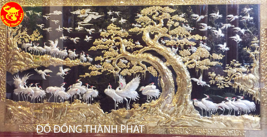 Tranh đồng phong thủy dài 2,3 rộng 1,3 Bách Hạc Quần Tùng mạ vàng, bạc được chạm thủ công từ tấm đồng vàng dày 7 - 8 dem. Các họa tiết hoa văn đều được người nghệ nhân chạm bằng tay vô cùng tỉ mỉ cẩn thận tạo cho bức tranh một vẻ đẹp hoàn mĩ. Bức tranh đồng mạ vàng bạc Bách Hạc Quần Tùng đẹp có khung được làm từ gỗ trò, gỗ dổi, gỗ gụ và gỗ hương với cách chạm hoa văn mắt ngọc và hoa văn vặn thừng ở vành ngoài của khung. với hình ảnh cây Tùng to lớn ở giữa bức tranh xung quanh là bầy hạc đủ 100 con đủ cả lớn và nhỏ. Bầy hạc với đủ cả hình ảnh đang bay lượn và đậu trên cây hay đậu ở dưới đất. Bức tranh được bố trí hài hòa cân đối tạo cho bức tranh một vẻ đẹp riêng biệt và thu hút ánh mắt của người nhìn.