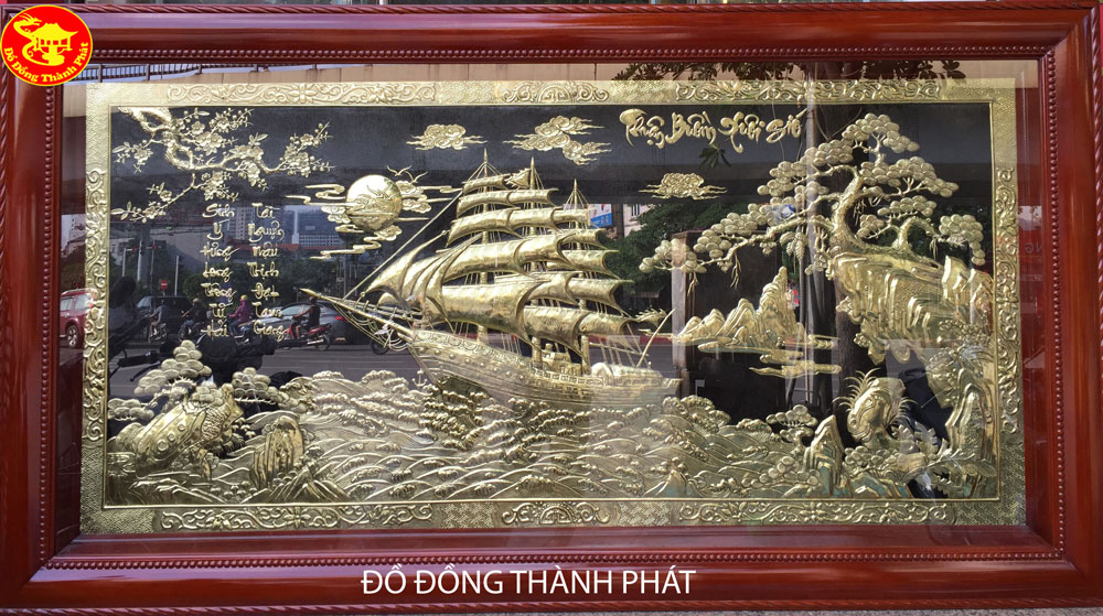 Tranh Thuận Buồm Xuôi Gió Bằng Đồng đẹp với kíc thước 2,3m rộng 1,3m được chạm khắc thủ công bằng tay từng chi tiết và hoa văn từ tấm đồng vàng dày 0,7 - 0,8 ly có nền đen. Bức tranh đồng Thuận Buồm Xuôi Gió được các nghệ nhân lành nghề Của cơ sở Tranh Đồng Thành Phát gò chạm cẩn thận và chi tiết. Khung bức tranh thuận buồn xuôi gió bằng đồng được làm từ gỗ tự nhiên (gỗ trò, gụ, hoặc gỗ dổi) được khắc mắt ngọc ở vành trong và khắc vặn thừng ở vành ngoài tạo cho bức tranh vẻ đẹp sang trọng.