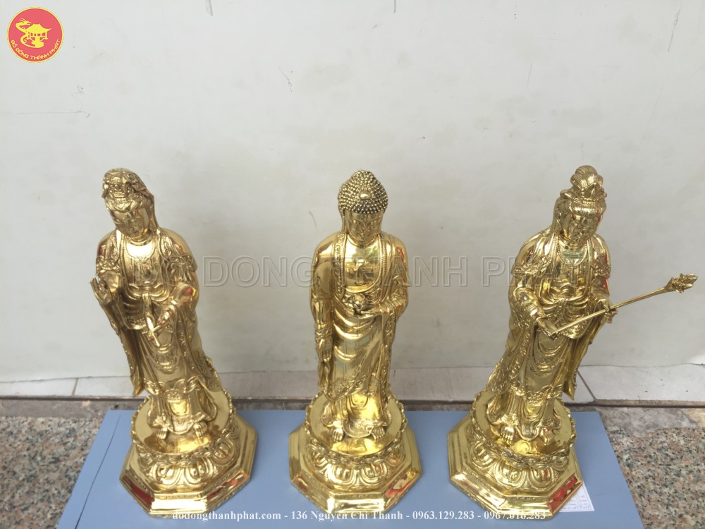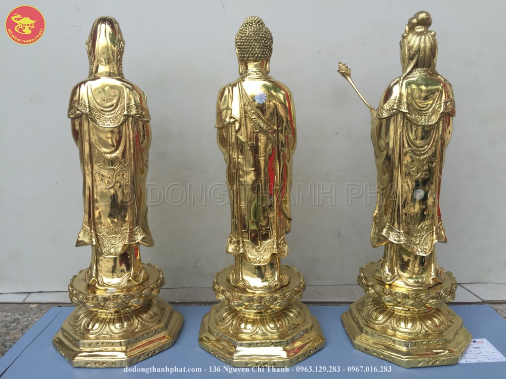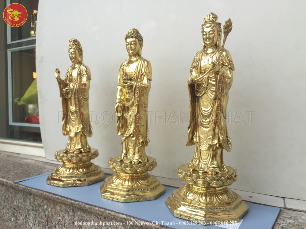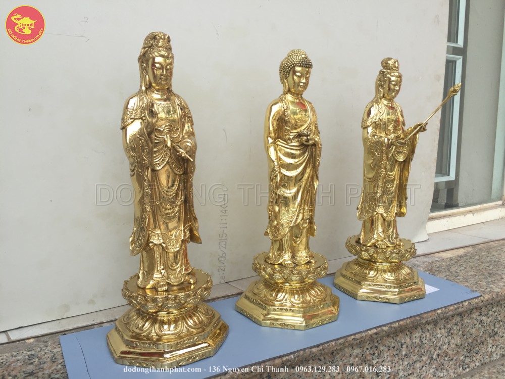 Bộ tượng phật bằng đồng tam thánh tây phương bao gồm tượng phật A Di Đà đứng giữa 2 vị bồ tát Quán Thế Chí và Quán Thế Âm. Bồ Tát Quán Thế Chí cầm cành sen đứng bên phải phật A Di Đà, còn phía bên tay phải Ngài là Bồ Tát Quán Thế Âm tay cầm bình tịnh thuỷ. Bộ tượng tam thánh tây phương có chiều cao 61 cm được các nghệ nhân đúc bằng đồng vàng nguyên chất. Tam thánh tây phương mang các thế đứng khác nhau và một ý nghĩa biểu tượng riêng.
