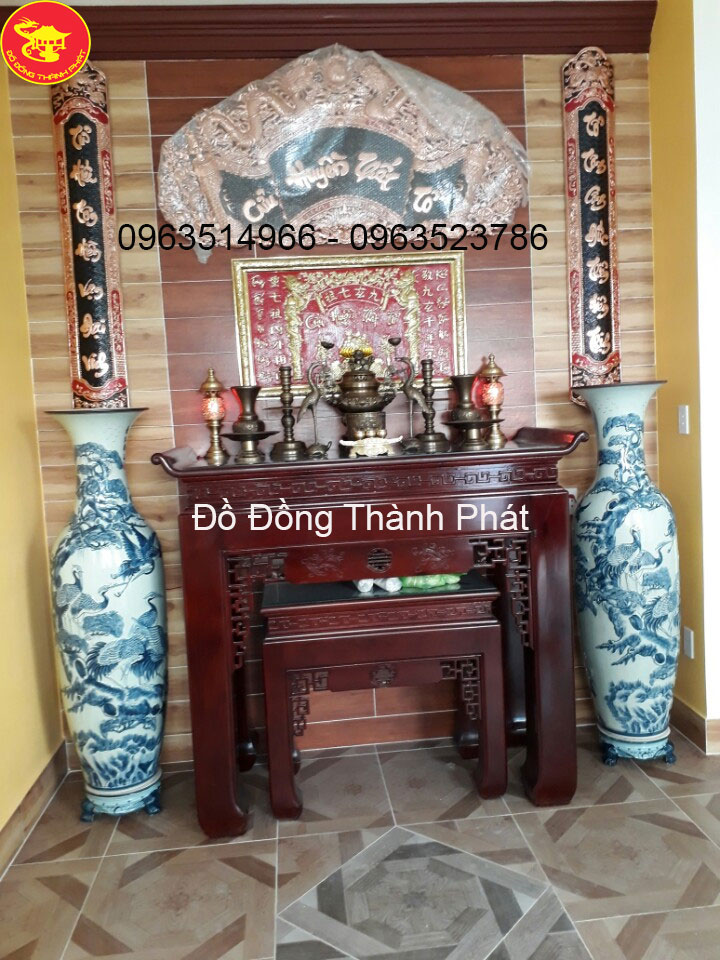Bộ đồ thờ cúng bằng đồng đầy đủ gồm bộ đồ thờ cúng bằng đồng hun cổ 50 với bộ cuốn thư câu đối thờ gia tiên 1,55 m quý khách quan sát.